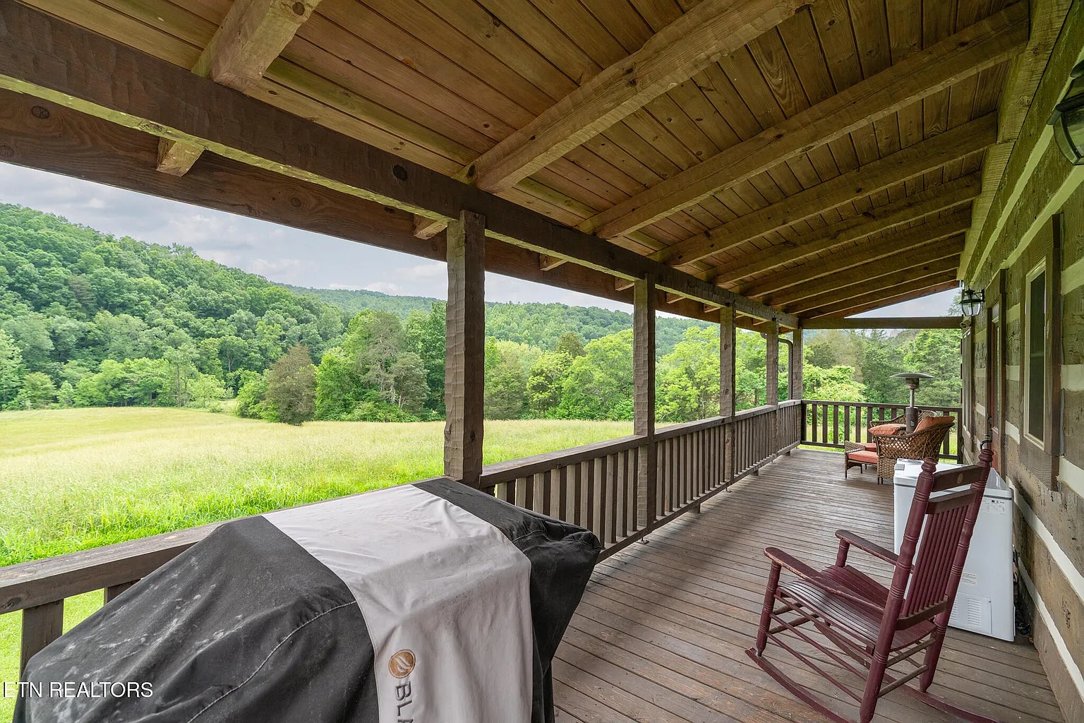 In addition, the cabin includes vaulted ceilings and a large stone fireplace in the living room. The primary suite provides a walk-in closet and a private bath, while the kitchen overlooks the property with wide views. Covered patios extend across both the front and back, creating outdoor space for gathering and relaxation.