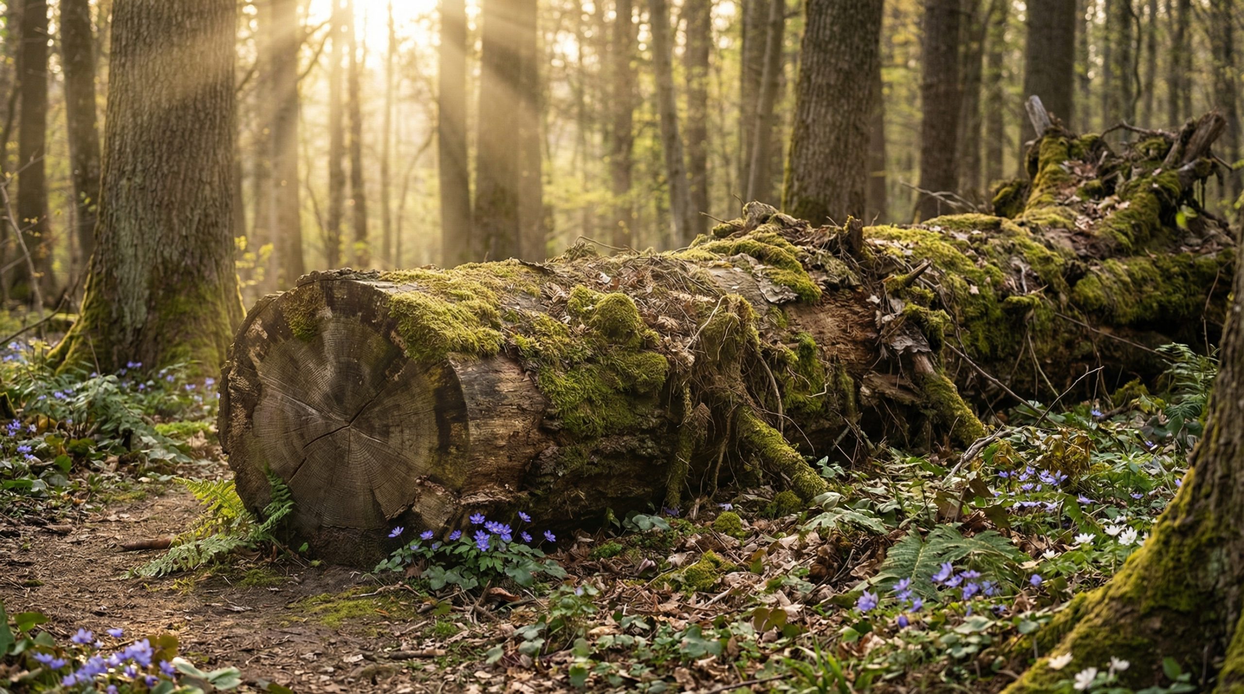 Imagine walking through a quiet forest in the soft light of early morning. Sun rays slip between tall trees, birds chirp in the distance, and leaves crunch under your feet. At first, everything looks completely natural. However, one massive fallen tree catches your eye. Moss, roots, and ferns cover the trunk, so it blends perfectly into the surroundings. Then you notice a warm glow coming from a curved wooden door and a small window. Suddenly, the ordinary forest scene turns into something magical.
