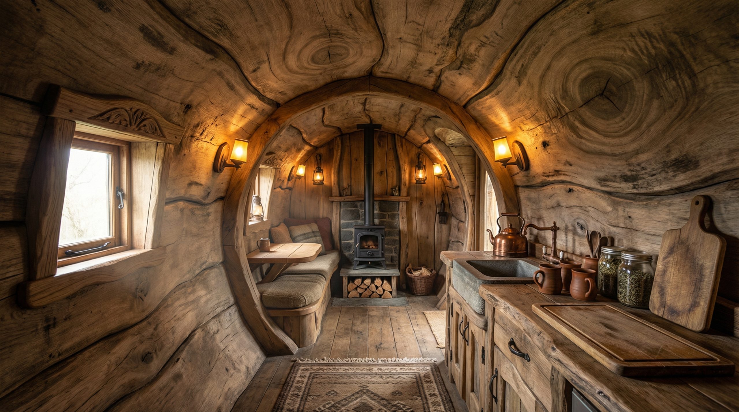 Once inside, the surprise continues. The interior follows the natural round shape of the tree, which creates a tunnel-like space. Smooth wooden walls curve gently around you, and the wood grain patterns add warmth and character. A built-in bench, a small table, and a compact kitchenette make the space feel practical. Copper mugs, glass jars, and wooden shelves add charm without creating clutter. In the center, a small wood stove provides both heat and a cozy focal point.