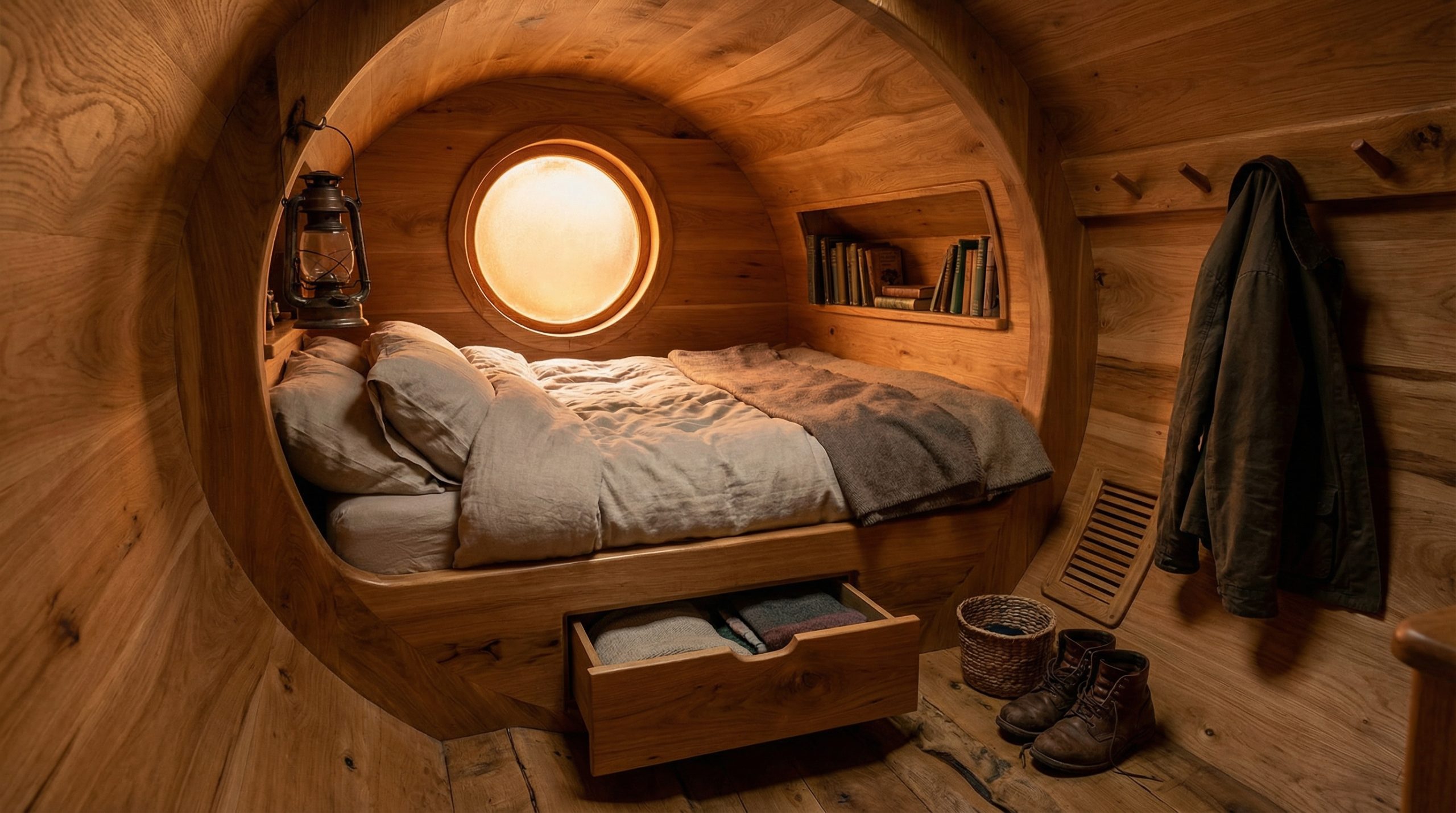 Further inside, a sleeping nook offers the perfect place to rest. A built-in bed fits neatly into the curved wall, and thick blankets make it look warm and soft. Above the bed, small shelves hold a few books and a lantern. In addition, hidden drawers under the bed provide useful storage. A pair of boots, a jacket on wooden hooks, and a woven basket complete the scene. Therefore, the space feels real and ready for everyday use.