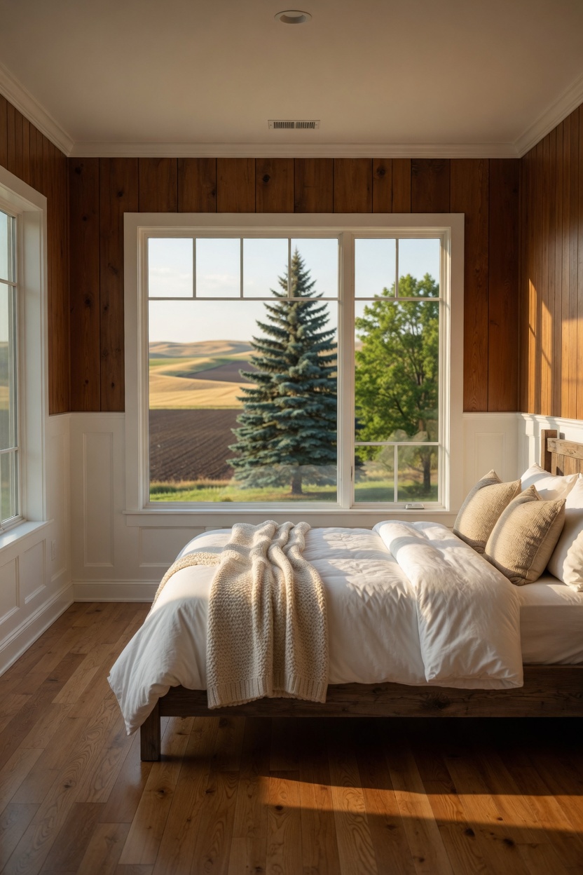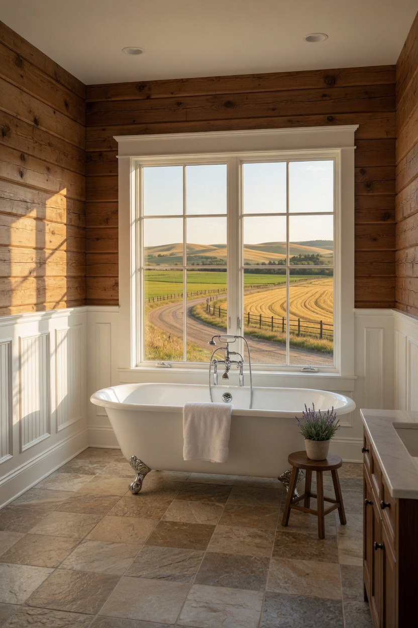 Finally, the master bathroom is a true sunlit retreat. I love how the warm wood walls meet the classic white beadboard. And of course, there’s that gorgeous vintage-style white clawfoot tub sitting right next to the window. Imagine soaking in there while watching the afternoon sun over that sweeping dirt road and the rustic fences.