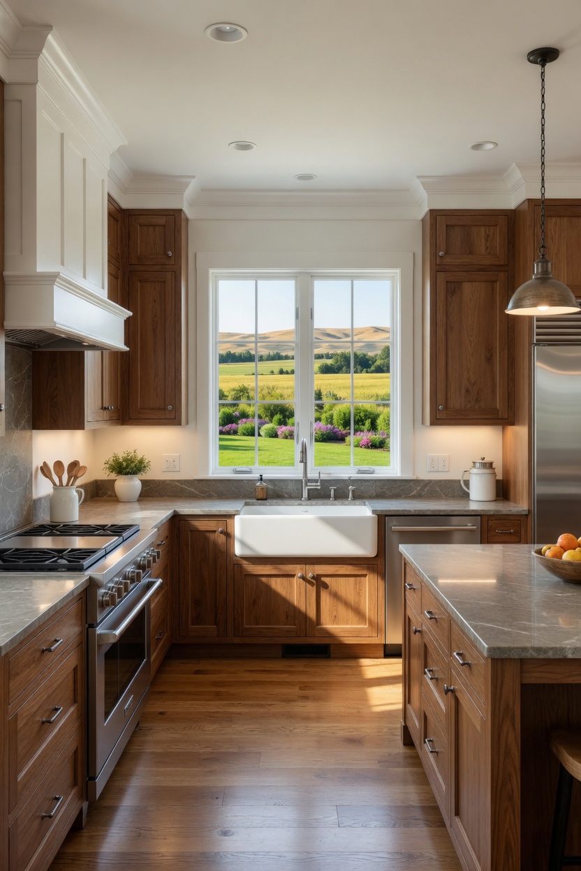 Now, let’s take a look at the kitchen in this rural estate. It is a brilliant mix of rustic warmth and modern farmhouse design. The custom wood cabinetry looks stunning against the muted stone countertops and the classic white farmhouse sink. Doing the dishes wouldn’t be a chore at all with that incredible view of the bright green lawn and distant golden hills right out the window.
