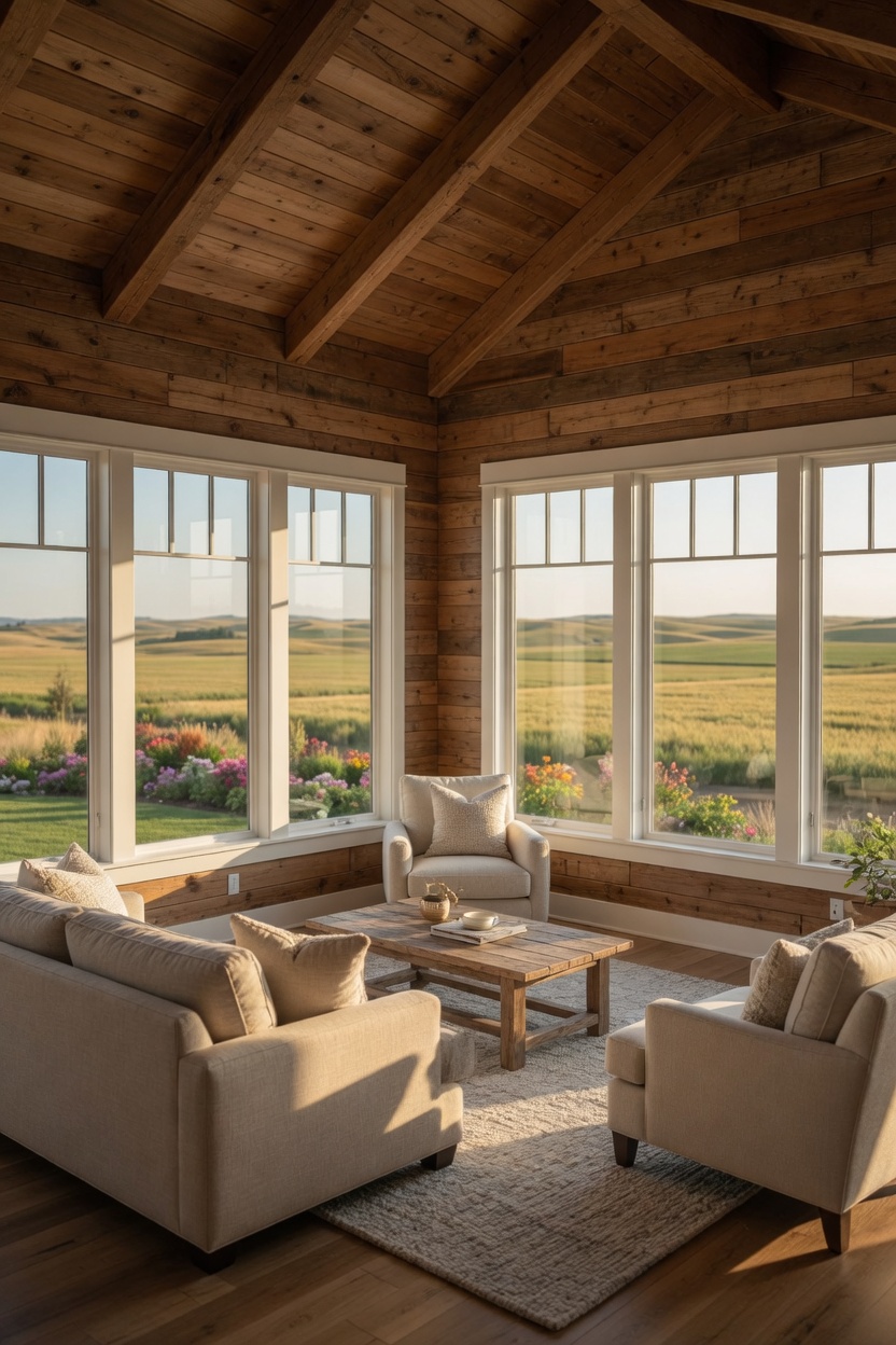 The living room is absolutely breathtaking. The warm wood planks on the walls and vaulted ceiling beams create such a cozy atmosphere. Those massive white-framed windows bring the outside in, framing the gorgeous flower beds and the sweeping fields. With the plush, neutral seating and that beautiful afternoon sunlight pouring in, it is such an inviting space to relax.