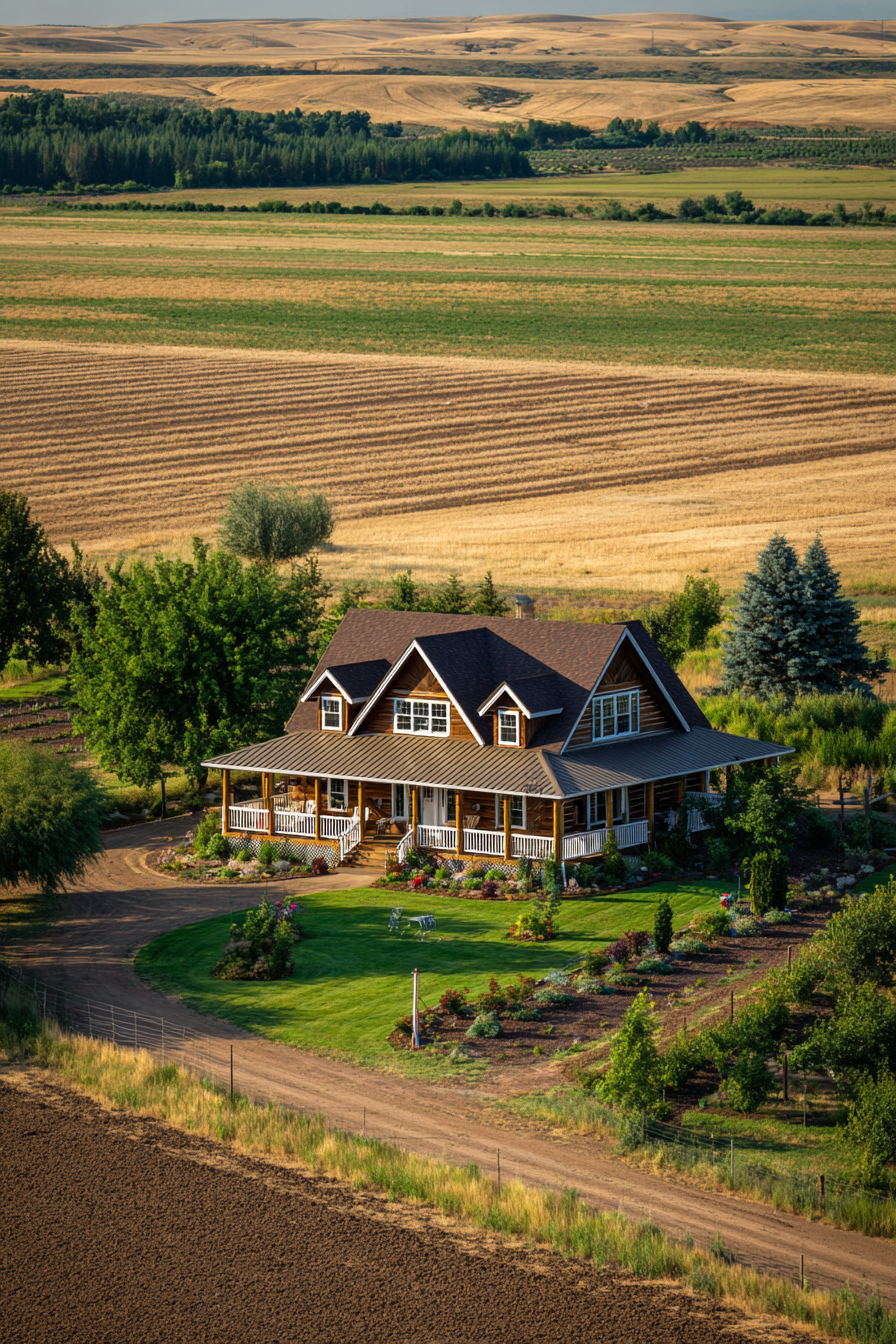 Let’s talk about the outside of this beautiful rustic cabin estate. It sits right at the edge of a winding dirt road, surrounded by vibrant gardens and vast, rolling agricultural fields. I am obsessed with the warm, medium-brown wood siding paired with that crisp white trim and the deep wraparound porch. It gives off such a welcoming, classic country vibe.