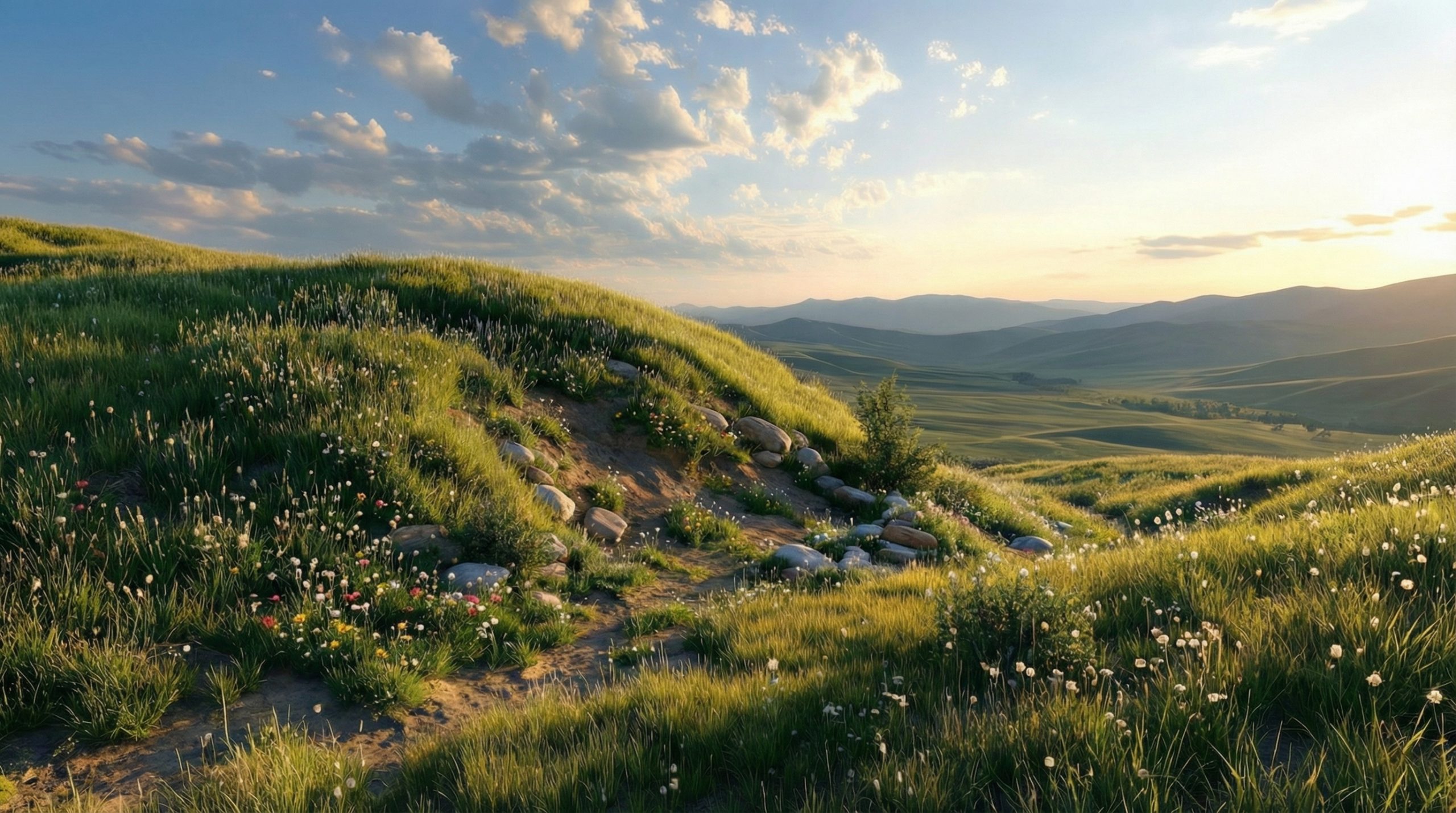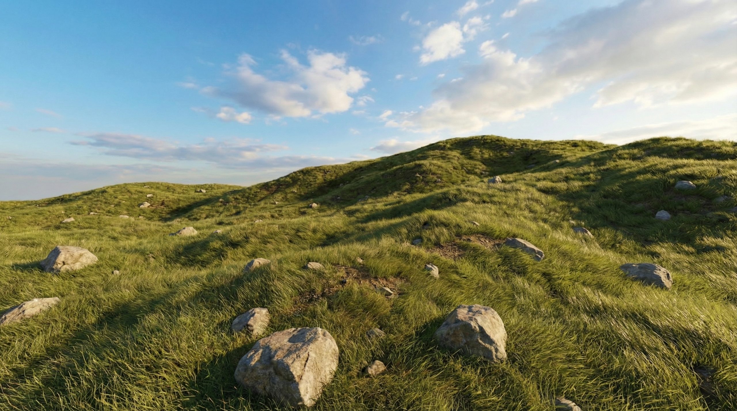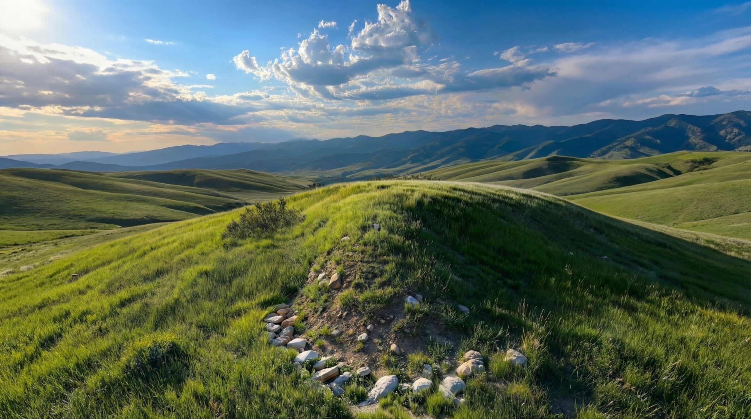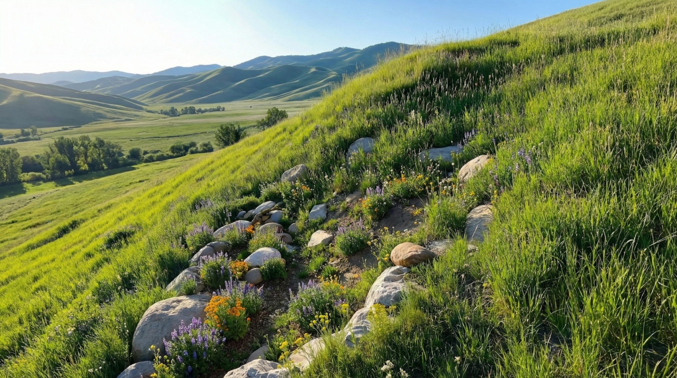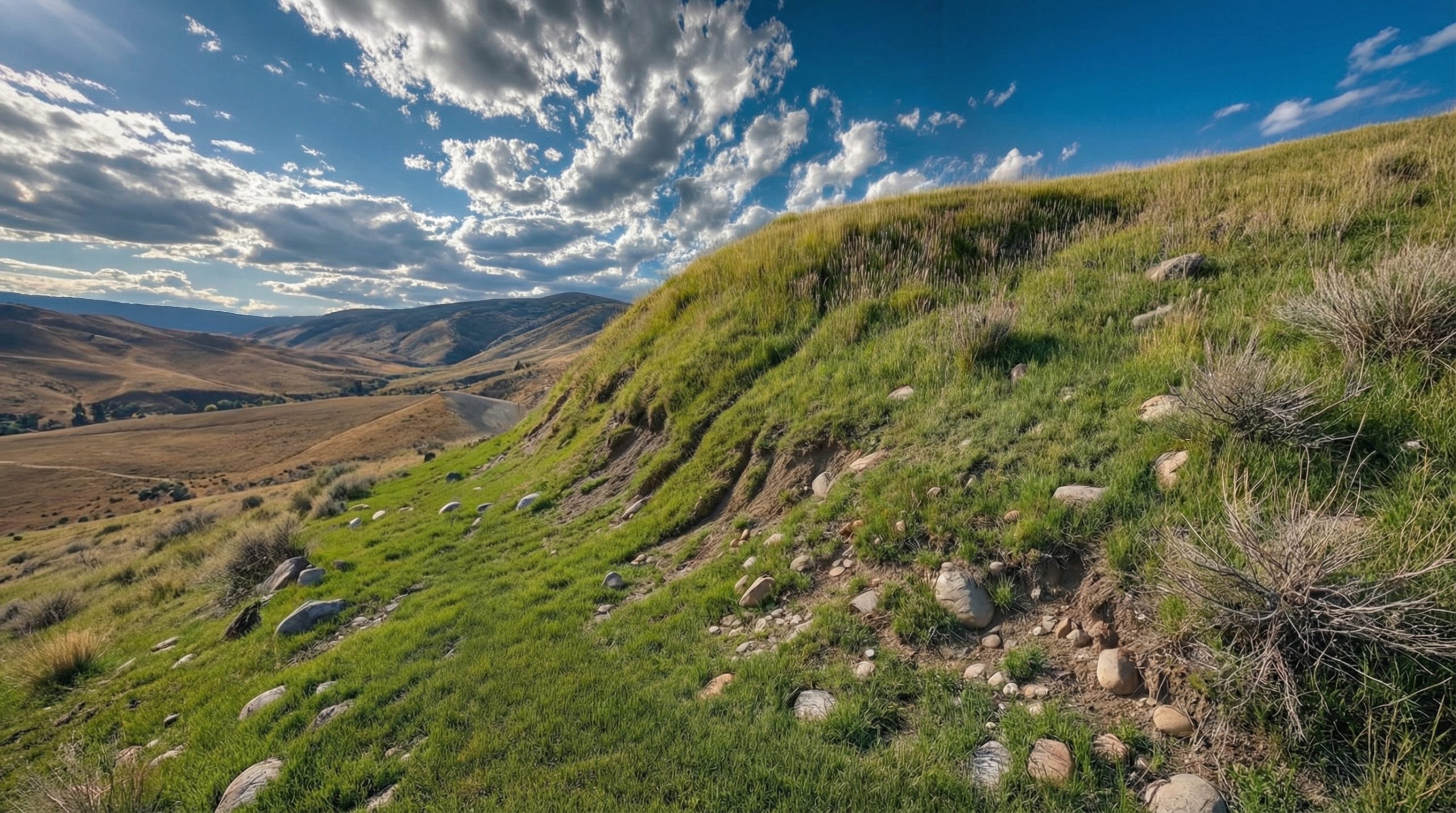 Before construction, this was simply a sloping hillside covered in grass, rocks, and natural soil. The terrain had gentle curves and a natural dip where the house would later sit. Nothing man-made stood here. The hill rolled smoothly into the distance, with dry grasses, scattered stones, and wide mountain views under a dramatic sky.