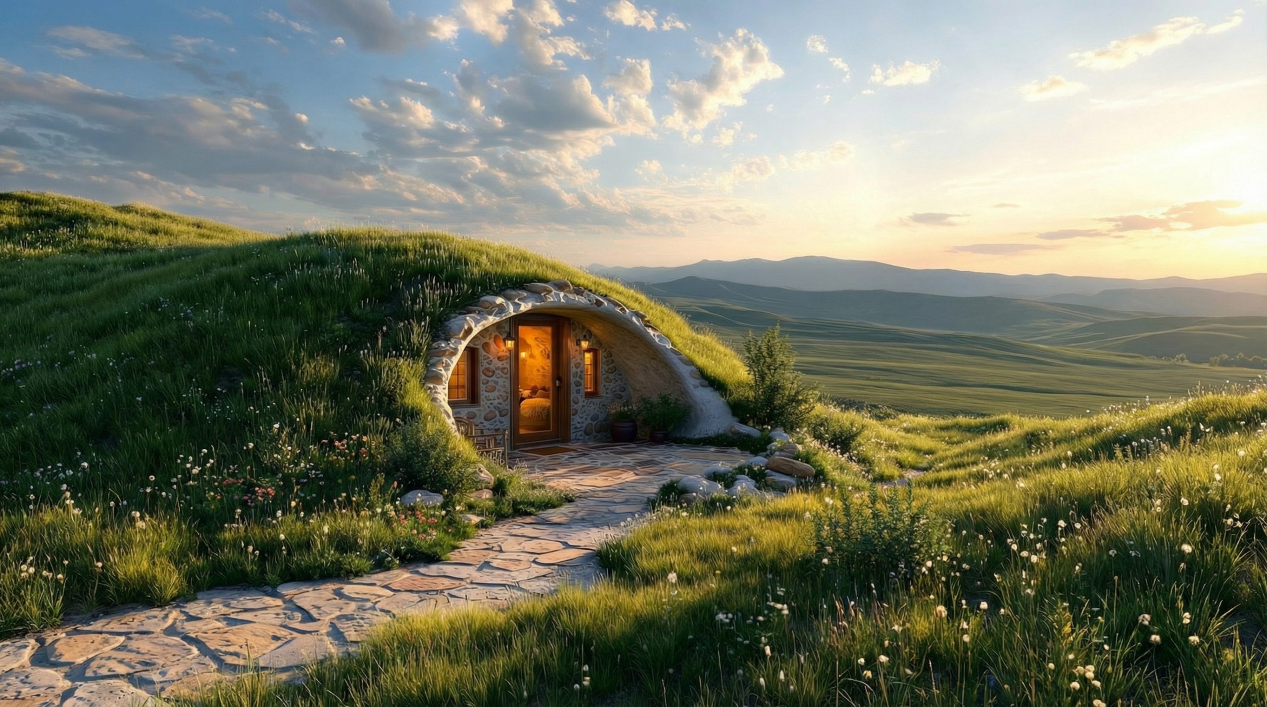 Hidden beneath rolling green hills, surrounded by wildflowers, stone paths, and endless skies, these hobbit-style earth homes feel like something out of a fantasy world — yet they are completely real. Designed to blend naturally into the landscape, these underground-style houses are not only visually magical but also incredibly smart. The grassy roofs act as natural insulation, helping keep the homes cool in summer and warm in winter. At the same time, their curved shapes and stone façades create a cozy, protected feeling that traditional homes rarely offer.