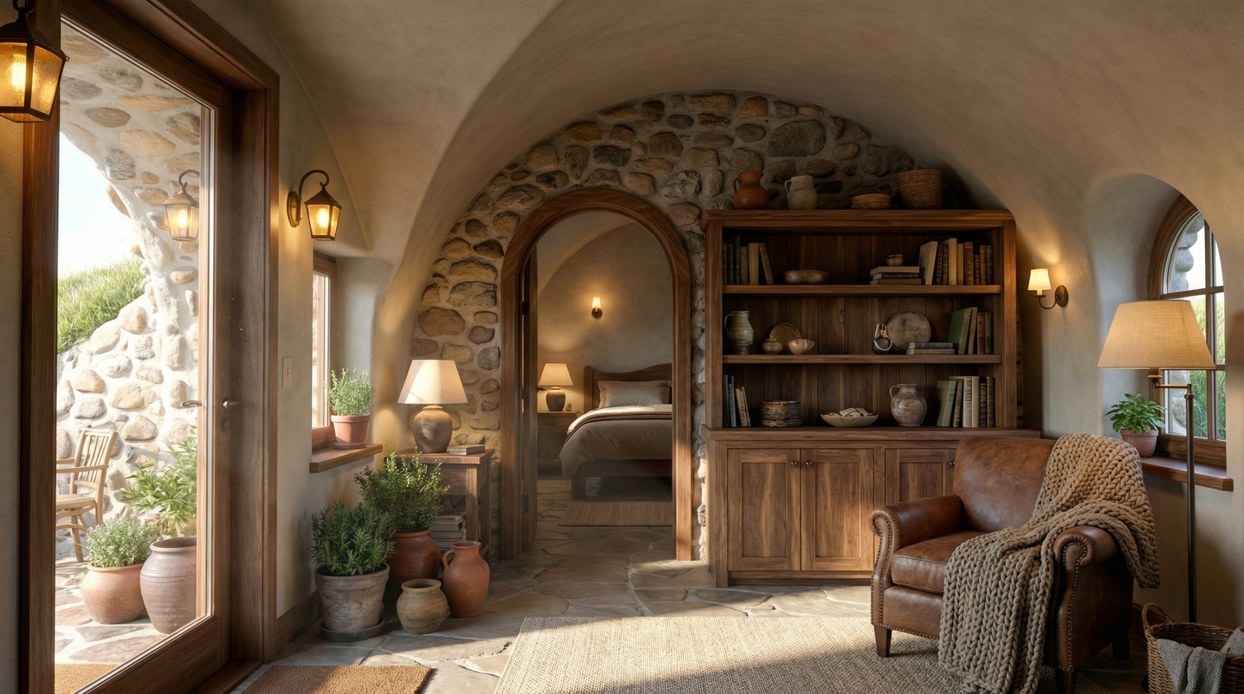 Inside, the home feels warm, calm, and welcoming. The curved ceiling and stone walls create a soft, sheltered atmosphere. Wooden shelves, books, plants, and gentle lighting make the space feel cozy and lived in. A comfortable chair, natural fabrics, and earthy colors add to the relaxing mood. The open doorway leading to the bedroom makes the space feel larger while keeping the intimate, cave-like charm.