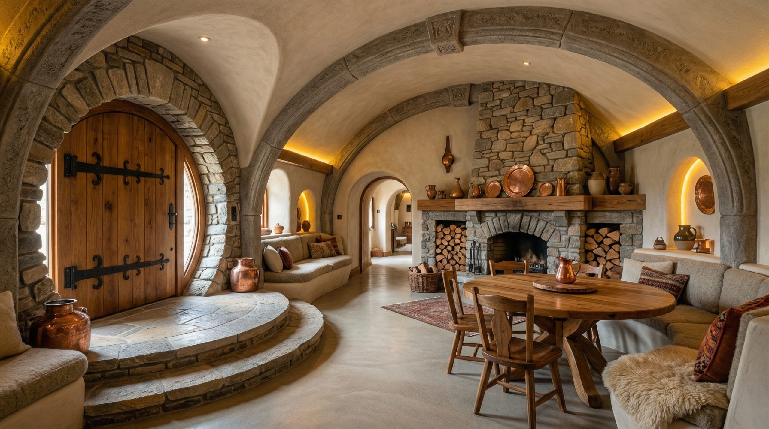 Inside, the home opens into a spacious stone and wood interior with arched ceilings that mirror the shape of the hill above. A large fireplace built from natural stone becomes the center of the space, with stacked firewood and warm lighting adding a cozy atmosphere.