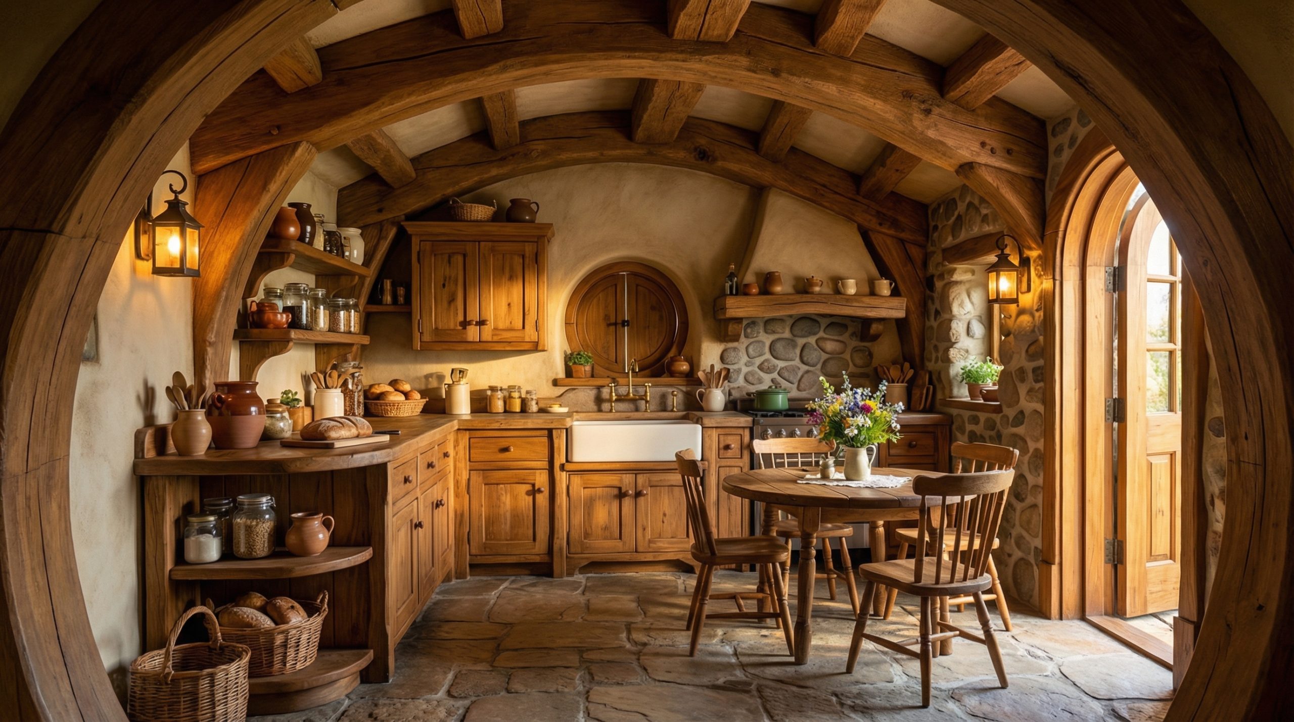 Inside, the home feels warm and welcoming. The kitchen features wooden cabinets, open shelves, stone walls, and exposed beams that follow the curved shape of the structure. Soft lighting from lantern-style fixtures creates a cozy glow. The round doorway, wooden table, and natural textures make the space feel simple, comfortable, and full of character. It’s a space designed for slow living, home-cooked meals, and relaxed evenings.