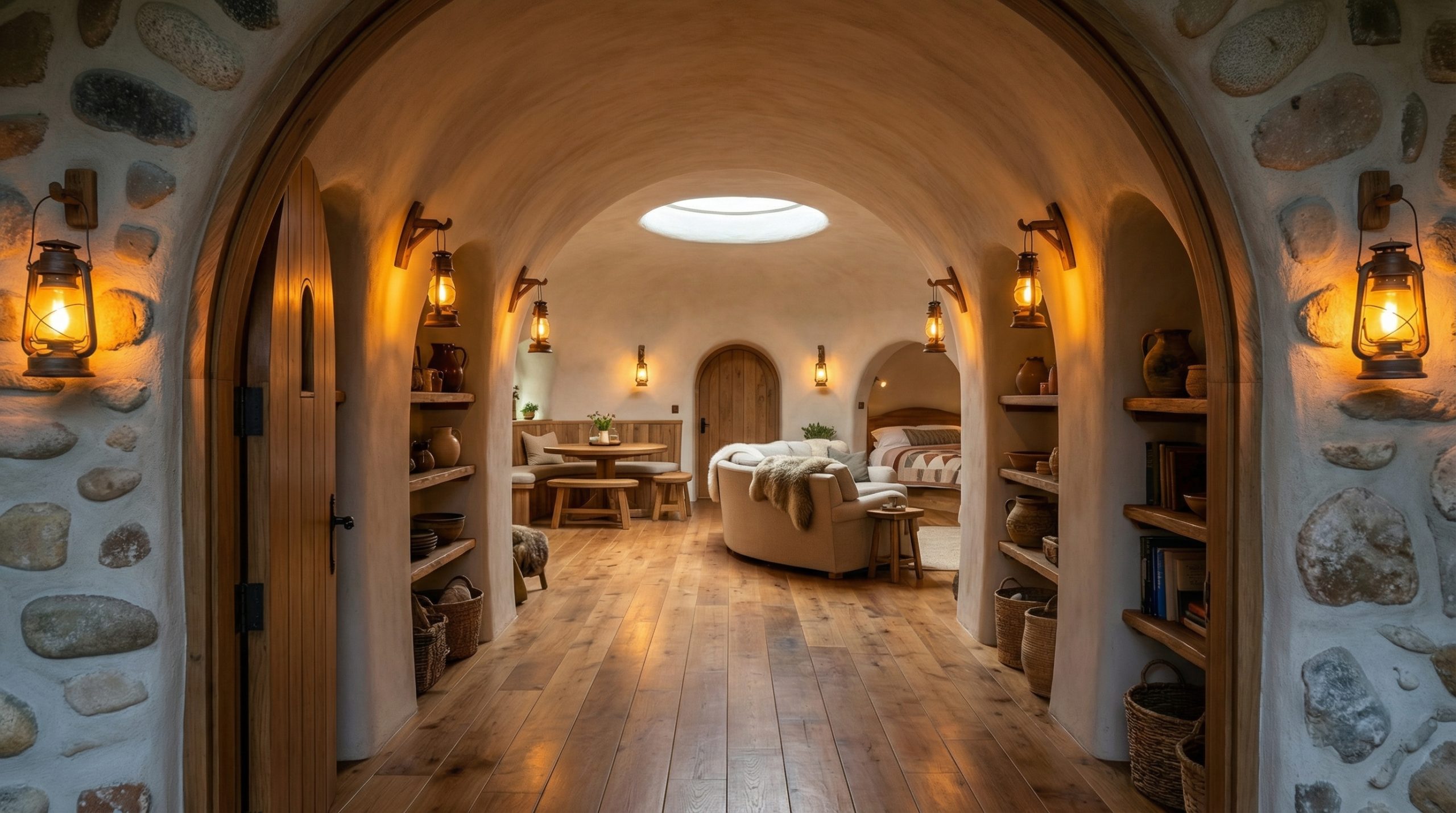 Inside, the home feels warm, soft, and peaceful. Wooden floors, rounded walls, and gentle lighting create a cozy atmosphere. Lantern-style lights add a rustic touch, while the open layout connects the sitting area, dining space, and sleeping area. A round ceiling window brings in natural light, making the underground space feel bright and open. The stone and wood details give the room a true hobbit-home character while still feeling comfortable for modern living.