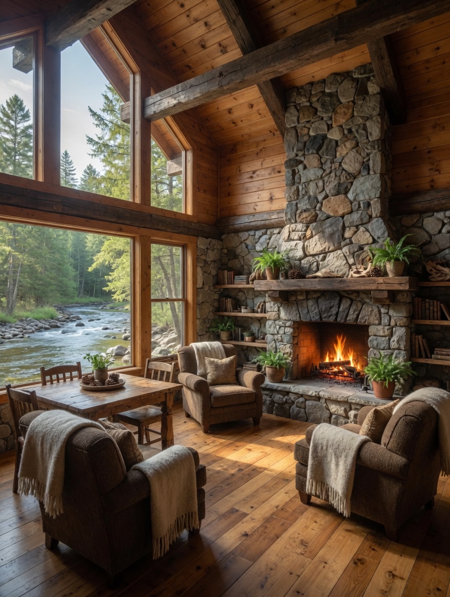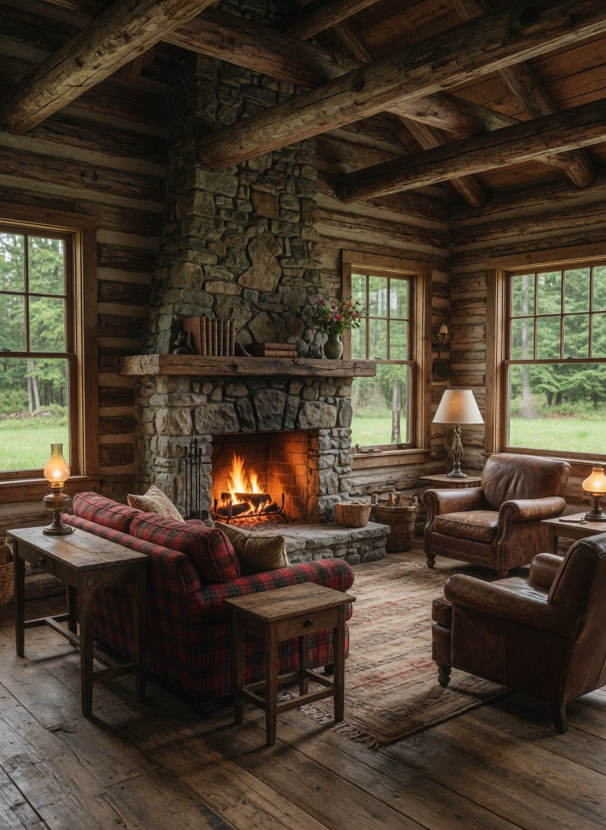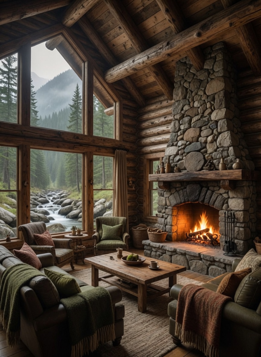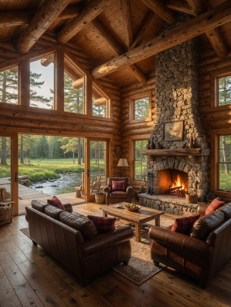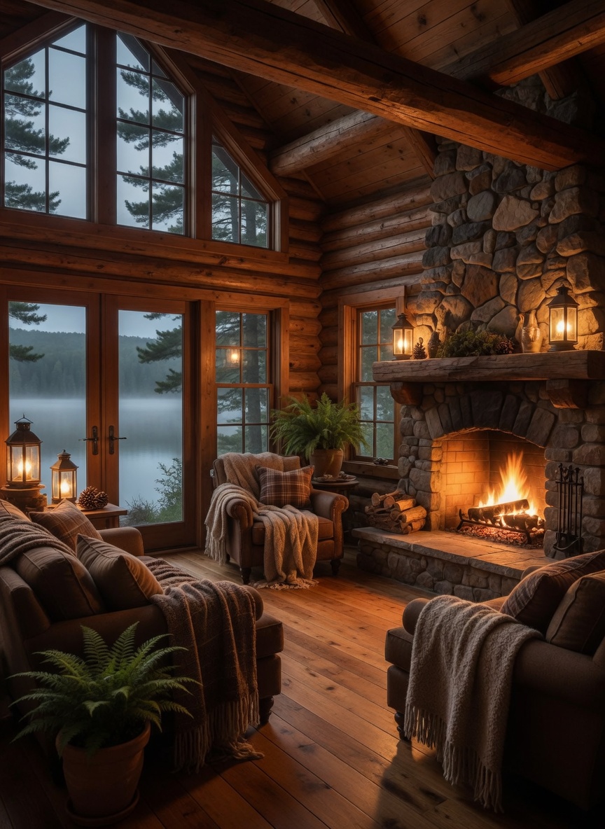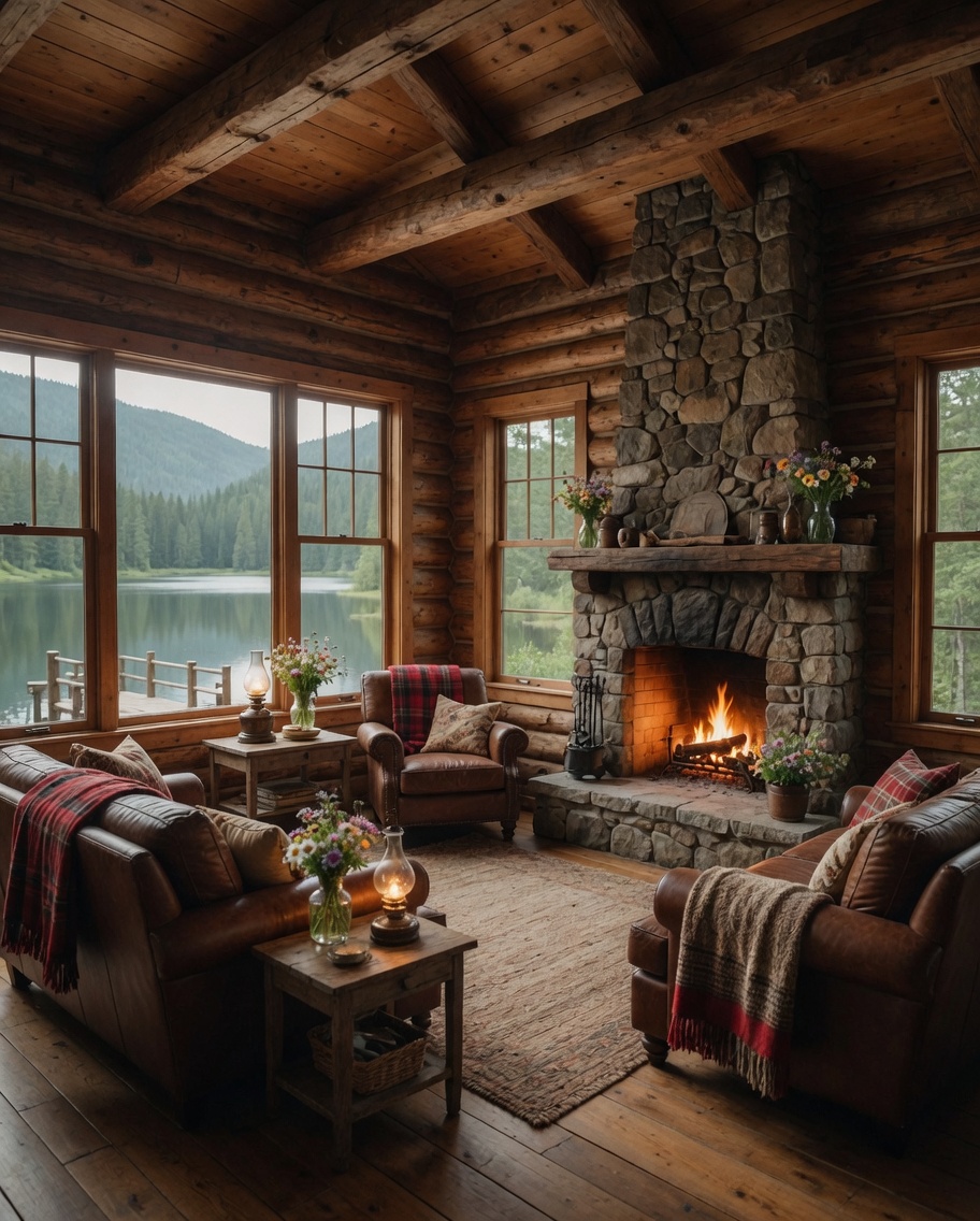 Keywords: rustic log cabin, cozy cabin interior, lakeside cabin, mountain cabin getaway, log cabin fireplace, dream cabin retreat