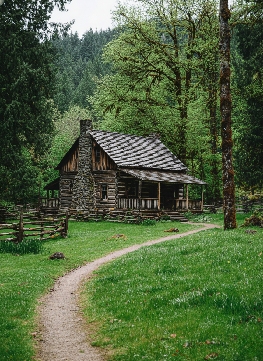 This beauty sits deep in a lush, moss-covered forest with tall evergreens all around. The exterior has that perfect old-school log cabin vibe: weathered wood, a sturdy stone chimney, a welcoming front porch, and a grassy path leading up to the door. It feels like a storybook pioneer home.