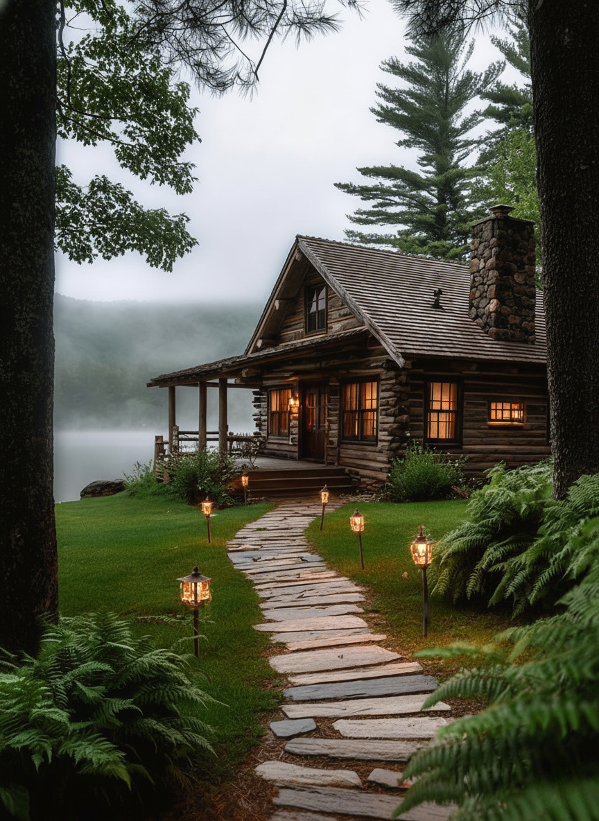 Imagine arriving at dusk to this log cabin on a misty lake. A winding stone path lined with glowing lanterns leads you to the front door while warm light spills from the windows. The exterior feels straight out of a fairytale — peaceful, romantic, and completely surrounded by nature.