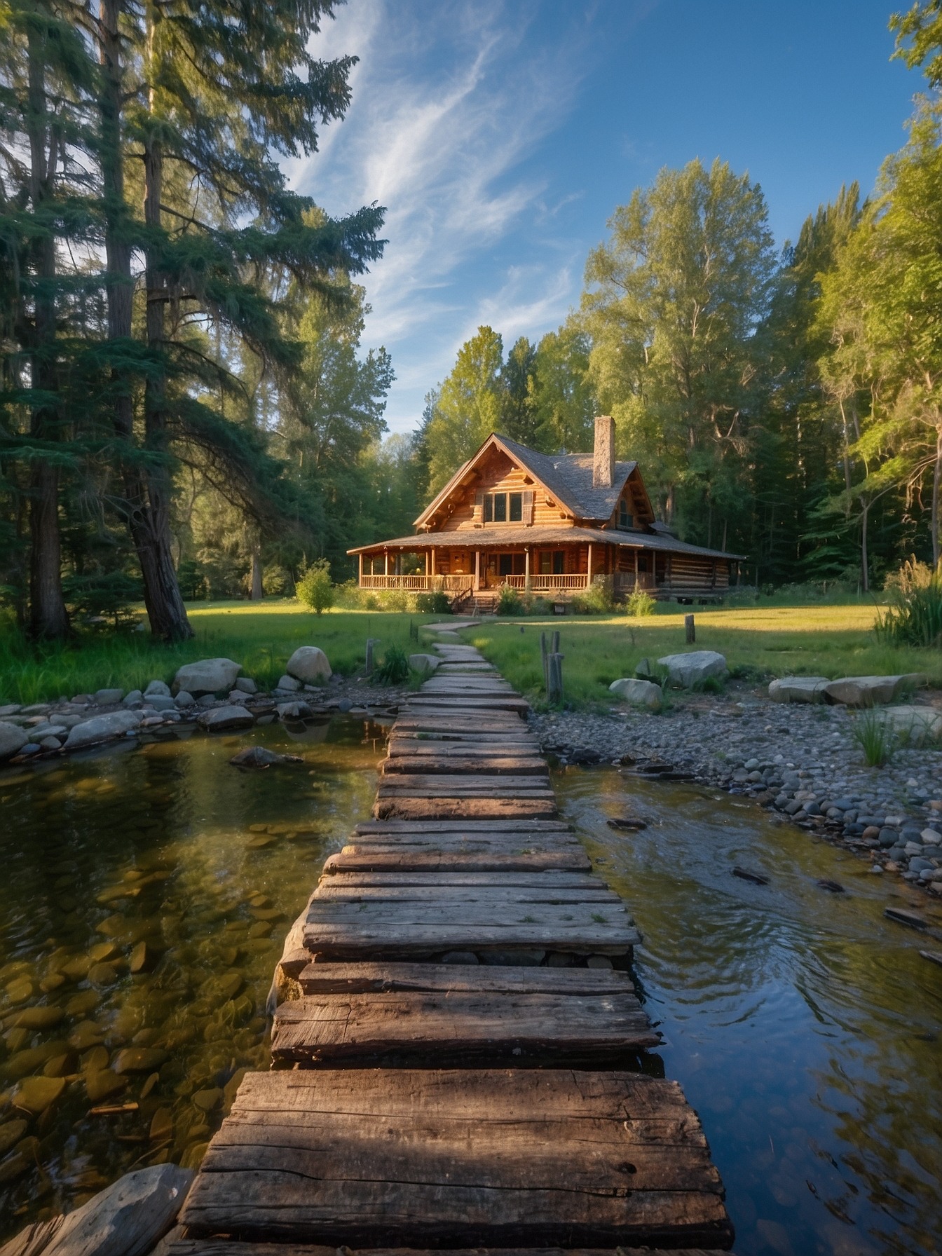 Bathed in golden sunlight, this larger log home sits beside a sparkling clear creek. A long wooden boardwalk crosses the water right to the door. Tall pines and bright blue skies make the exterior feel cheerful and full of life.