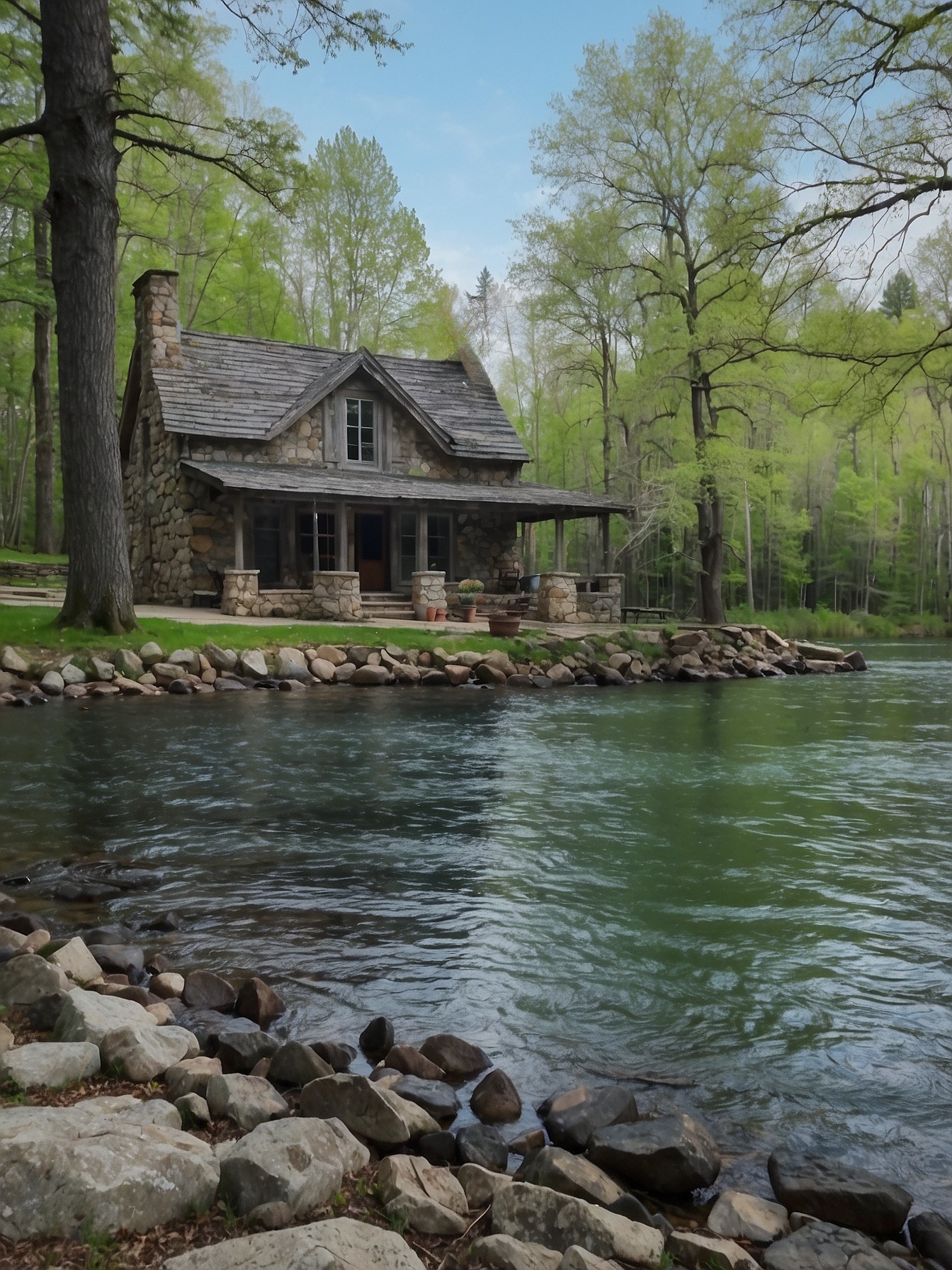 This substantial stone-and-log cabin is built right on the rocky bank of a wide, peaceful river. The exterior has that solid, built-to-last feel with mature trees framing the scene beautifully.