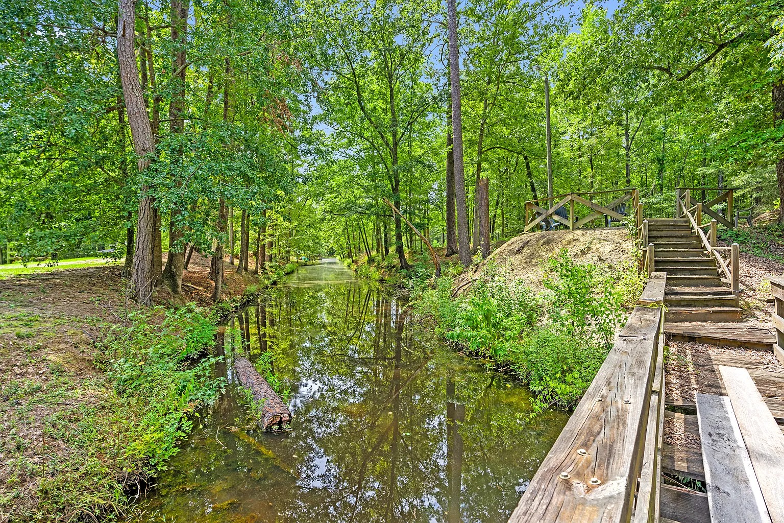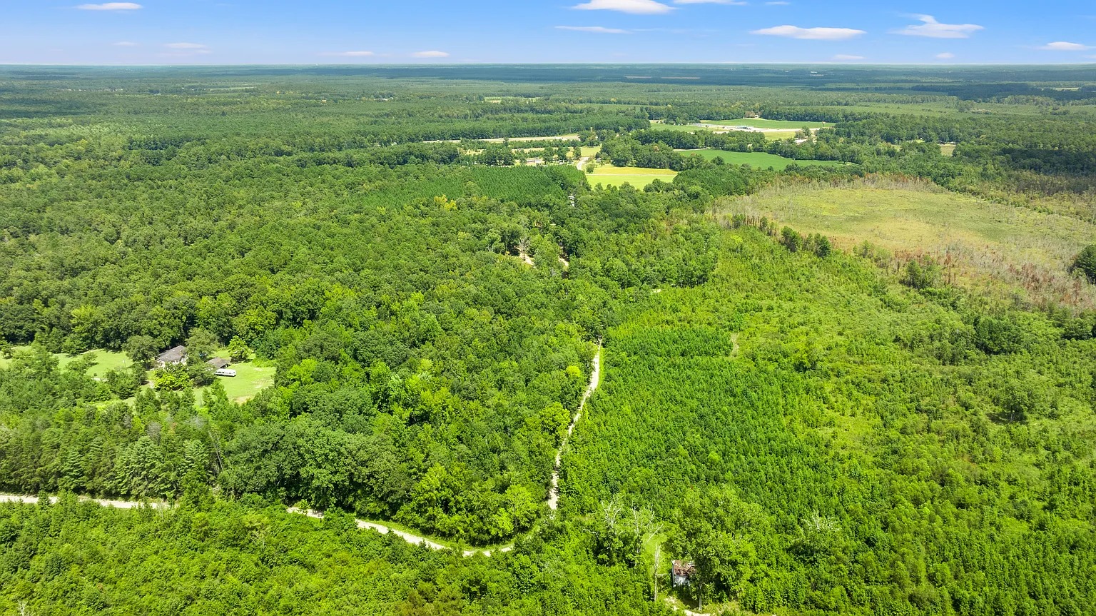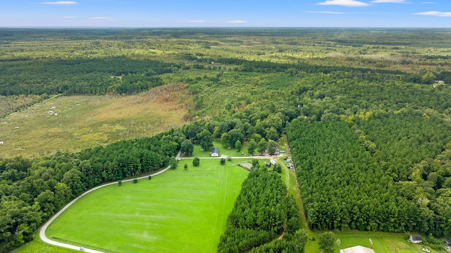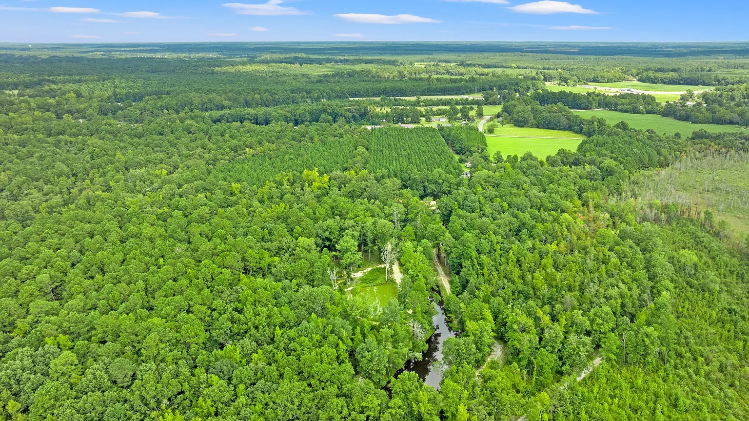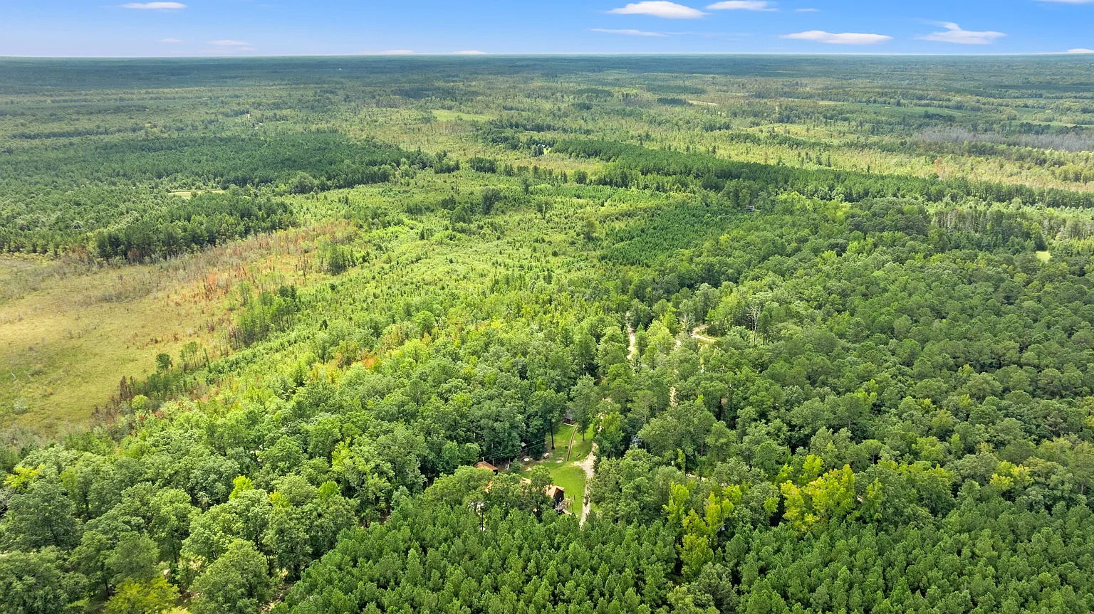 Built in 2017, this private estate in Marion offers room to unwind and explore. The property spans 120 acres in the Pee Dee region, featuring open fields, timber stands, a stocked pond, and a flowing stream. Moreover, wildlife thrives throughout the acreage, including deer, turkey, ducks, and geese. Because of this natural setting, the land supports hunting, fishing, quiet walks, or simply enjoying time outdoors with family and friends.