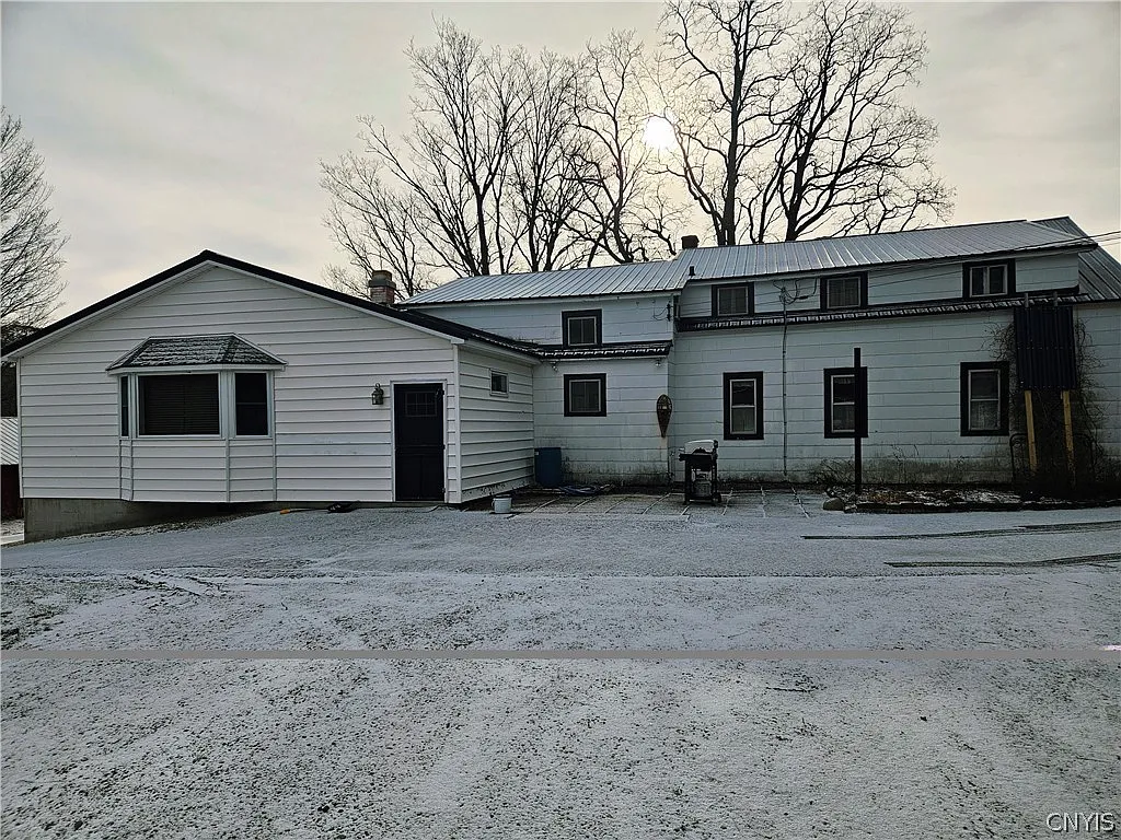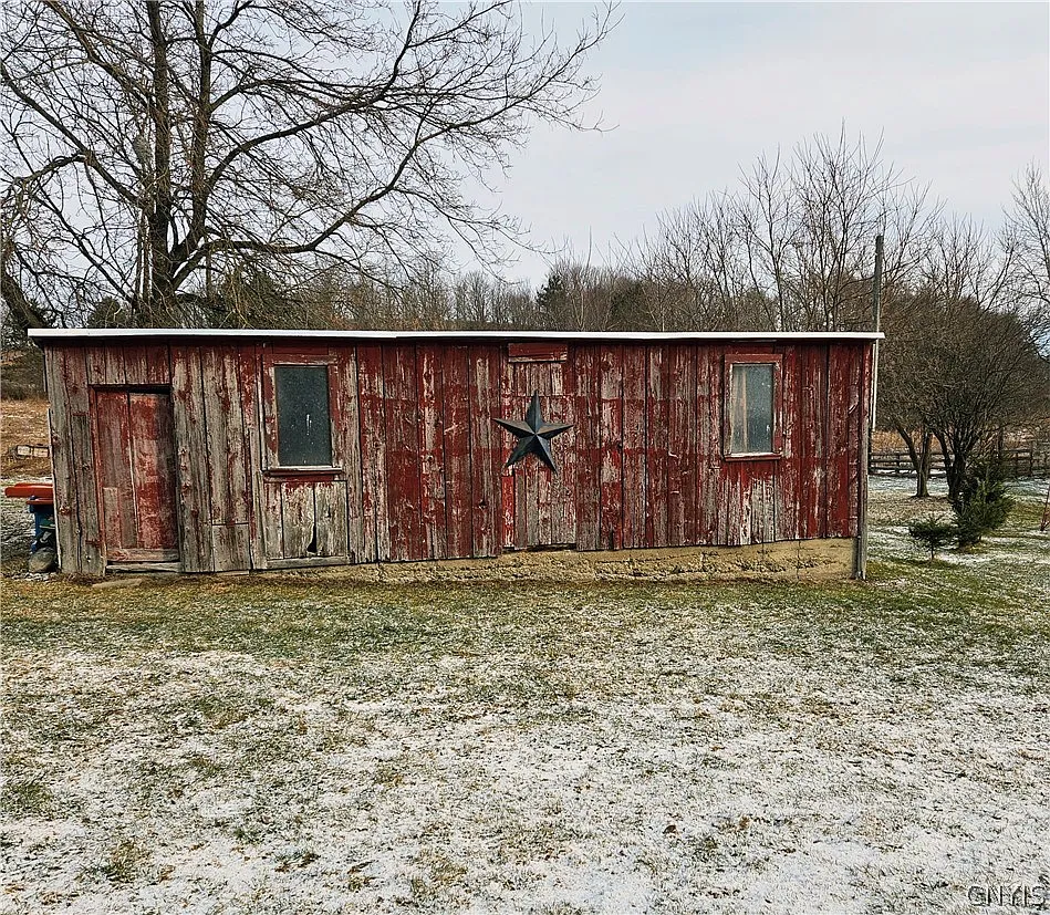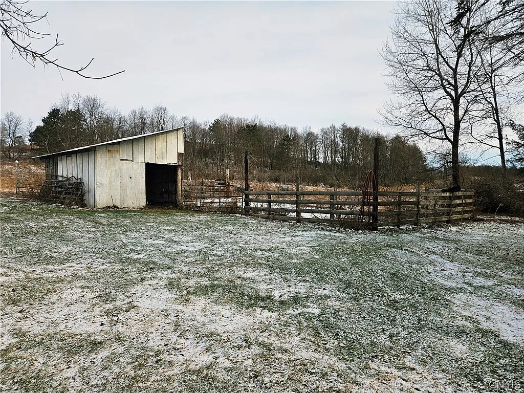 A four-bedroom farmhouse sits on 50 acres in Hamilton, New York, offering a mix of living space and agricultural land. The home includes three bathrooms and about 2,467 square feet of interior space. The property combines a traditional house with fenced pasture and multiple outbuildings. Because of that, it may suit small-scale farming or long-term land use. In addition, the acreage provides room for animals, gardening, or future projects.