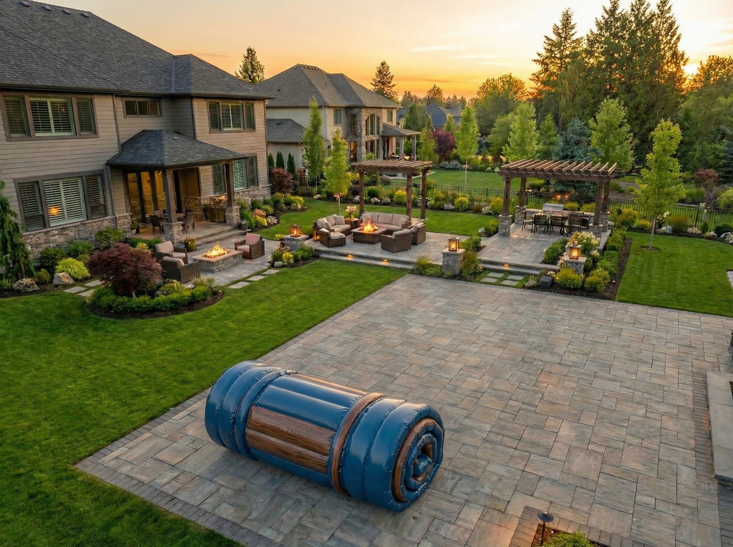 This giant inflatable pirate ship pool shows how a simple backyard can turn into a fun summer setup. The process starts with a compact roll placed on a clean patio. At first, it looks small and easy to store. However, once opened, the real size and design begin to appear.