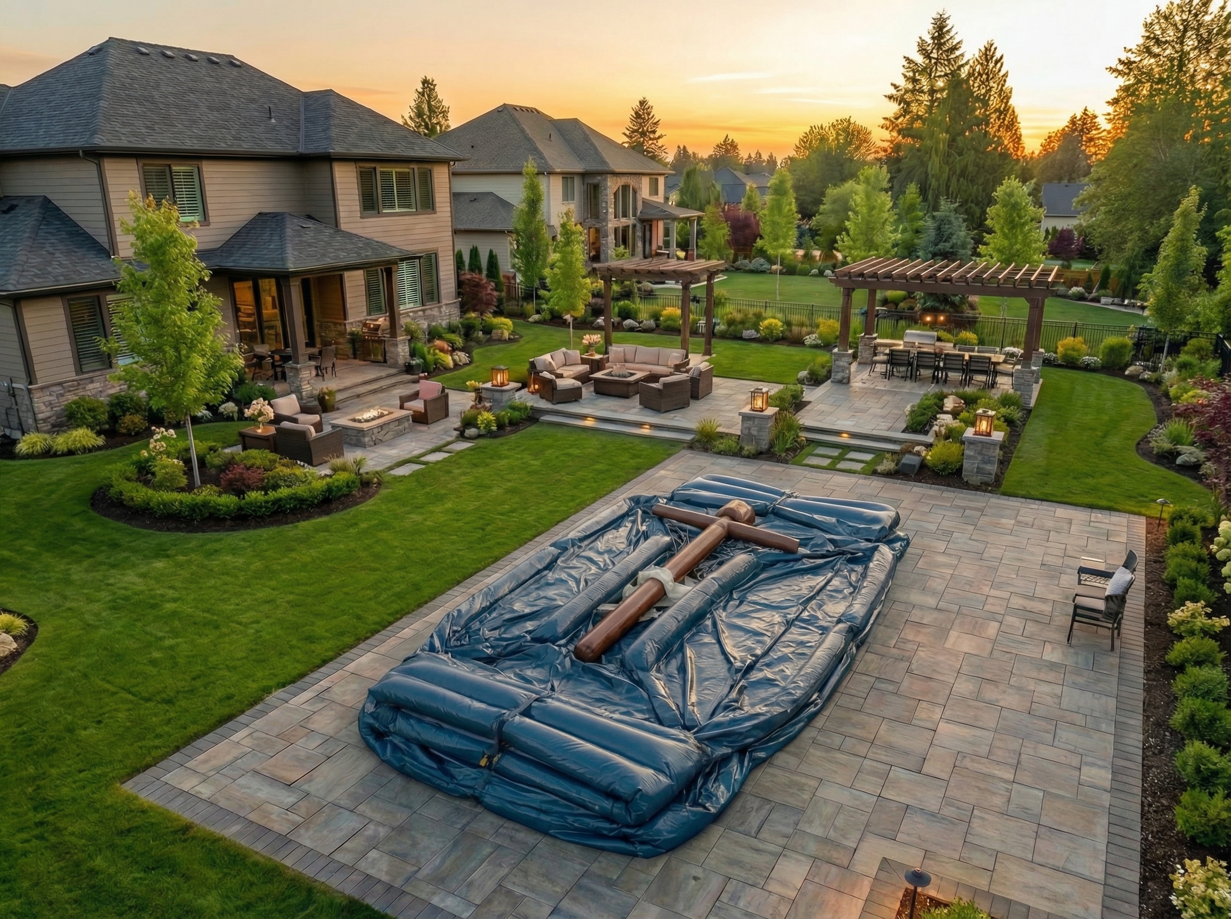 In addition, the backyard environment adds to the experience. The clean patio, green lawn, and soft sunset lighting create a calm and inviting atmosphere. As a result, the pool becomes part of a complete outdoor lifestyle, not just a simple inflatable.