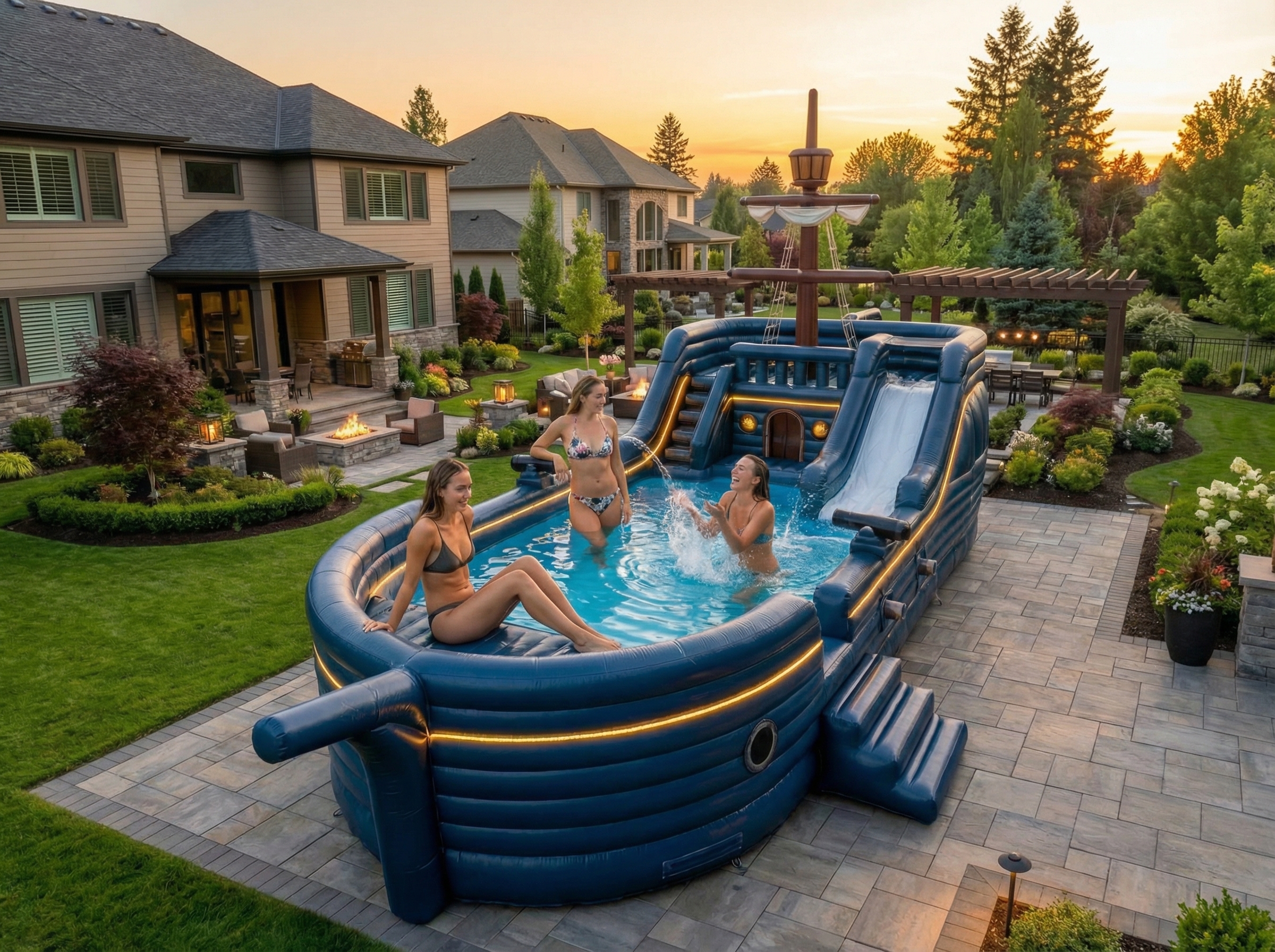Giant Inflatable Pirate Ship Pool Setup: From Roll to Backyard Fun