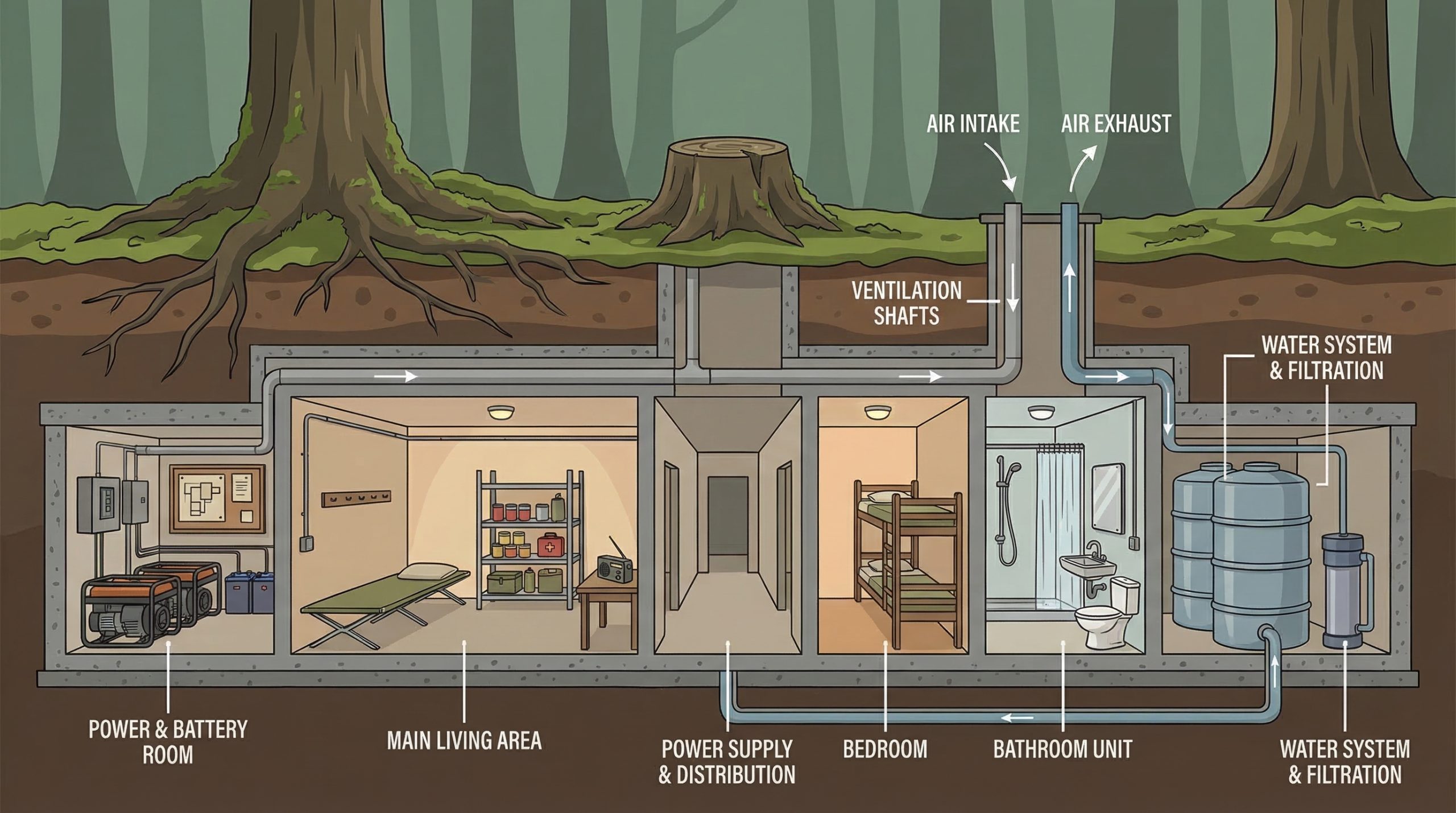 What helps this hidden forest bunker stand out is that the rooms feel connected. The bunker is not presented as random cool images. It works more like a compact underground layout with a clear logic.
