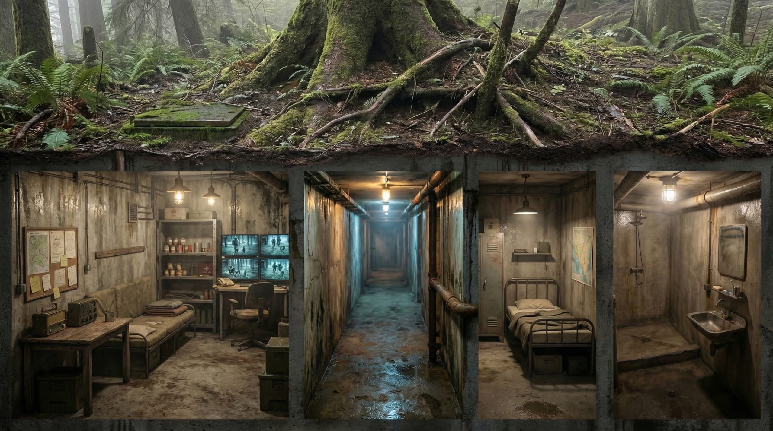 Even though this is a fictional concept, it feels believable because the details stay consistent from start to finish. The forest above is wet, cold, and organic. The bunker below is damp, enclosed, and practical. Together, they create a hidden underground world that feels surprisingly complete.