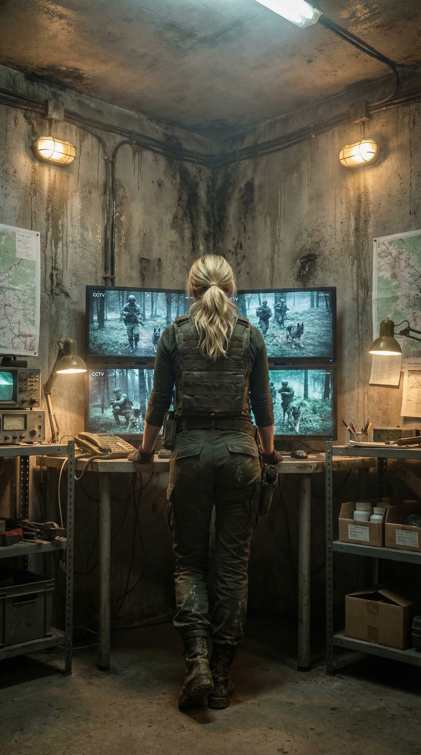 The control room is built with stained concrete walls, exposed pipes, industrial lights, and a rugged workstation. Multiple monitors display CCTV-style camera feeds from the forest above. These screens show search activity outside, including armed soldiers and tracking dogs moving through the trees. That detail adds tension to the bunker concept and gives the room a real purpose.