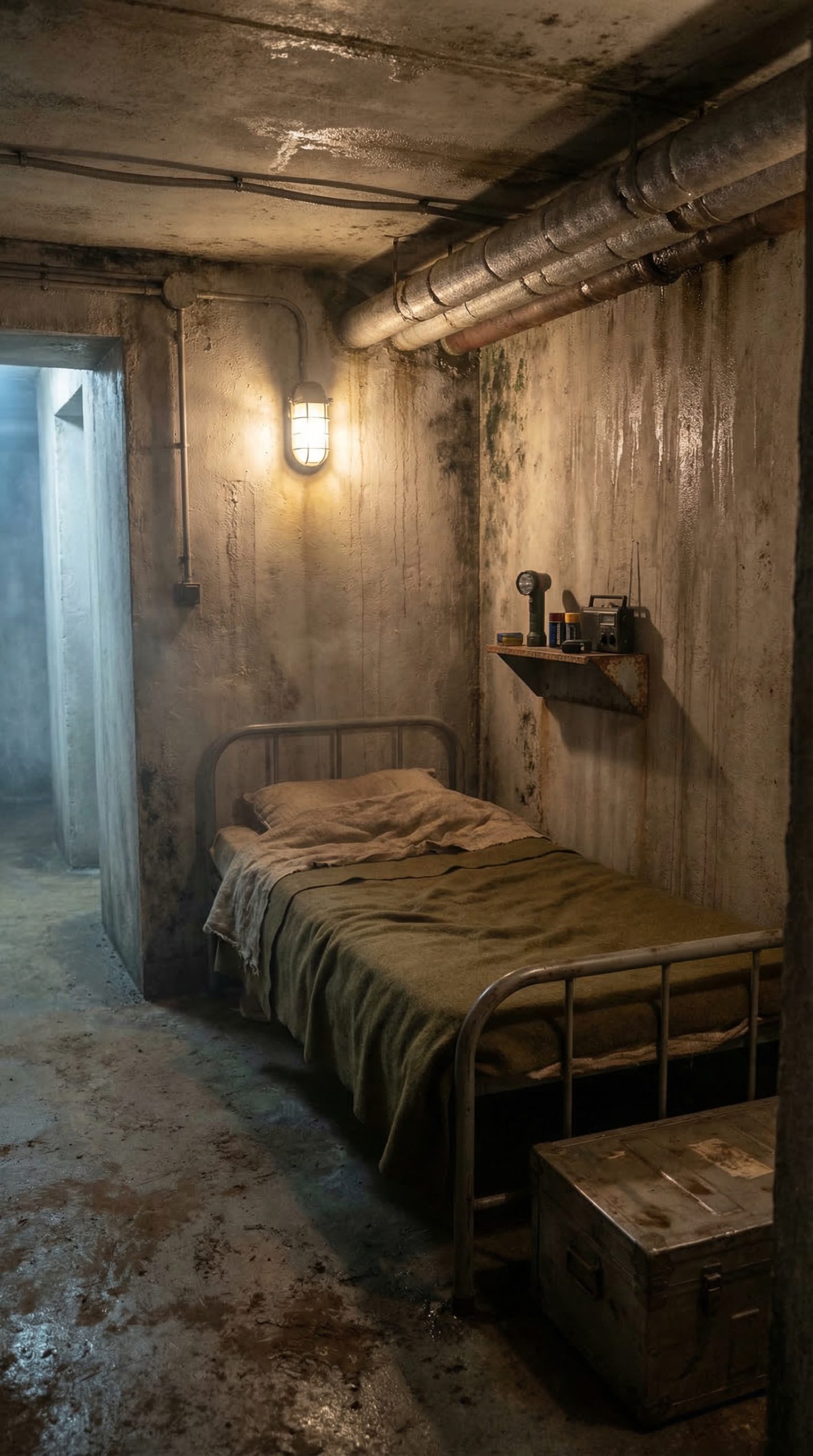 The bedroom is compact and practical. It includes a single metal bed, worn bedding, a small shelf, and basic storage. The walls are damp concrete with visible age and moisture stains. A warm industrial wall light gives the room enough light to feel usable without making it feel comfortable in a luxury sense. It still looks like part of the same underground system.