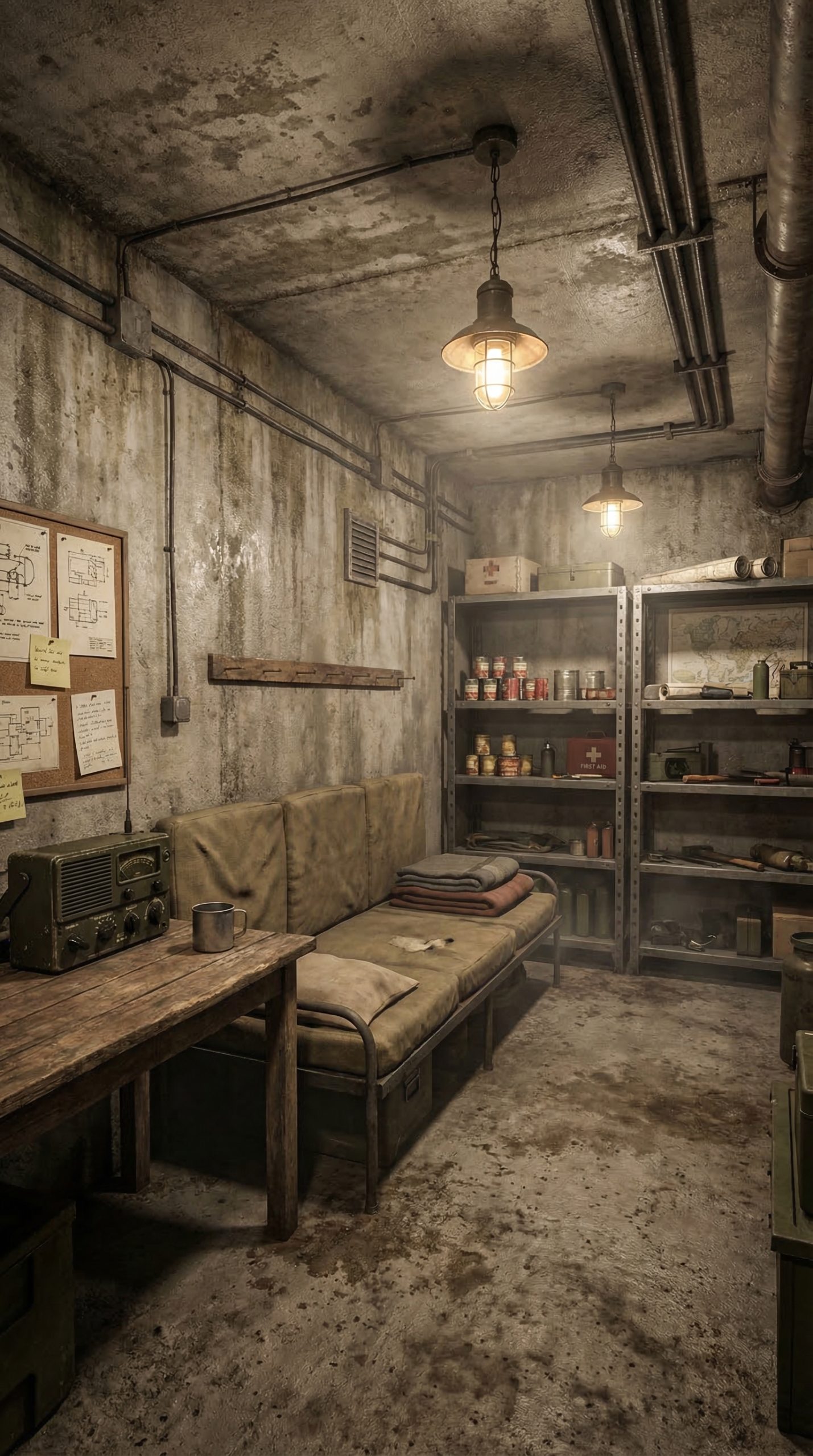 The control room connects to a narrow bunker hallway. That hallway links the bedroom, living room, and bathroom. All rooms share the same materials, colors, and atmosphere. The ceilings stay low. The concrete remains damp and stained. The lighting stays industrial and warm. Therefore, the whole shelter feels like one believable space instead of several unrelated scenes.