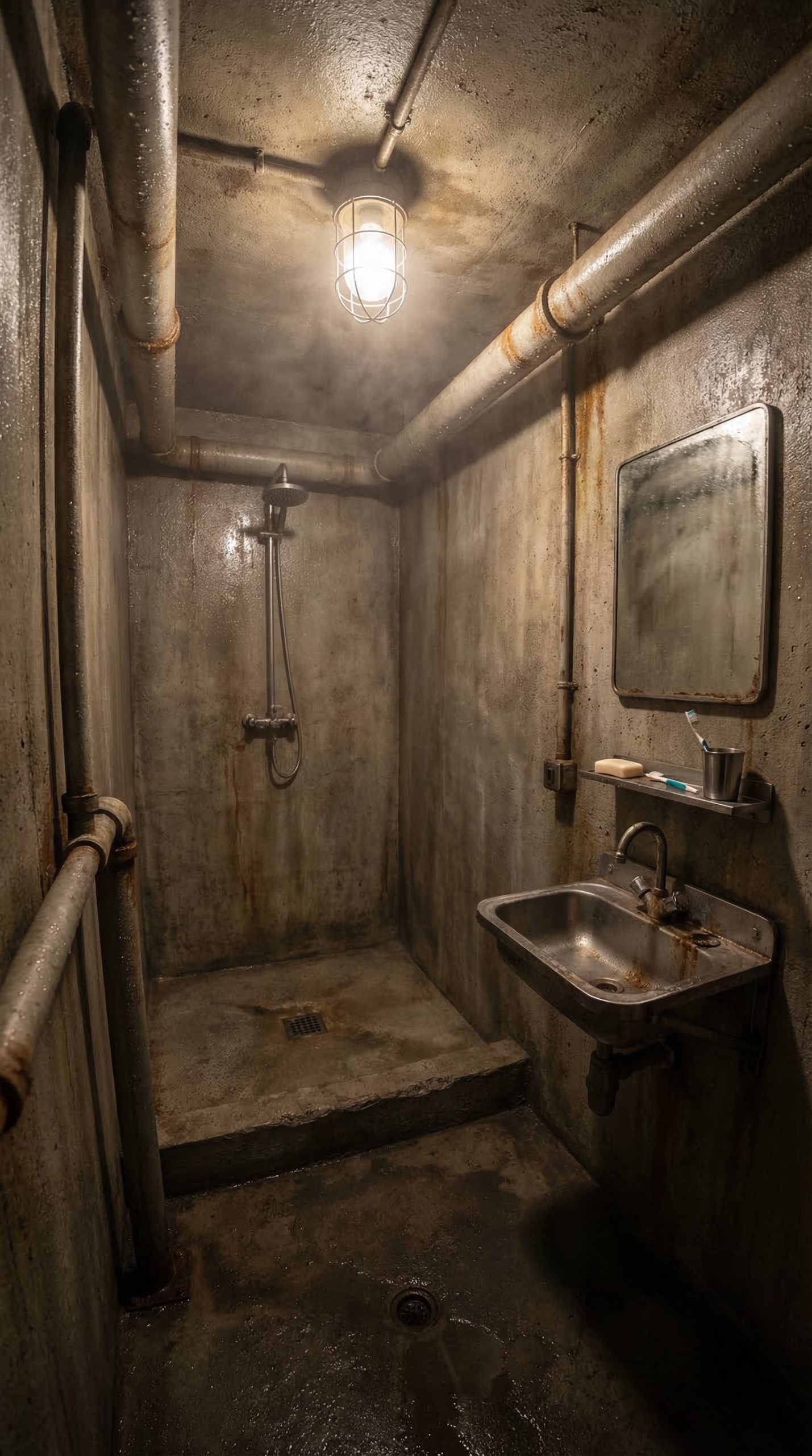 The bathroom is just as raw. It includes a concrete shower area, a small metal sink, exposed plumbing, drainage in the floor, and heavy moisture on the walls. Again, the design stays practical. Hygiene matters in any survival space, so even a small bathroom makes a big difference in how usable the bunker would be.