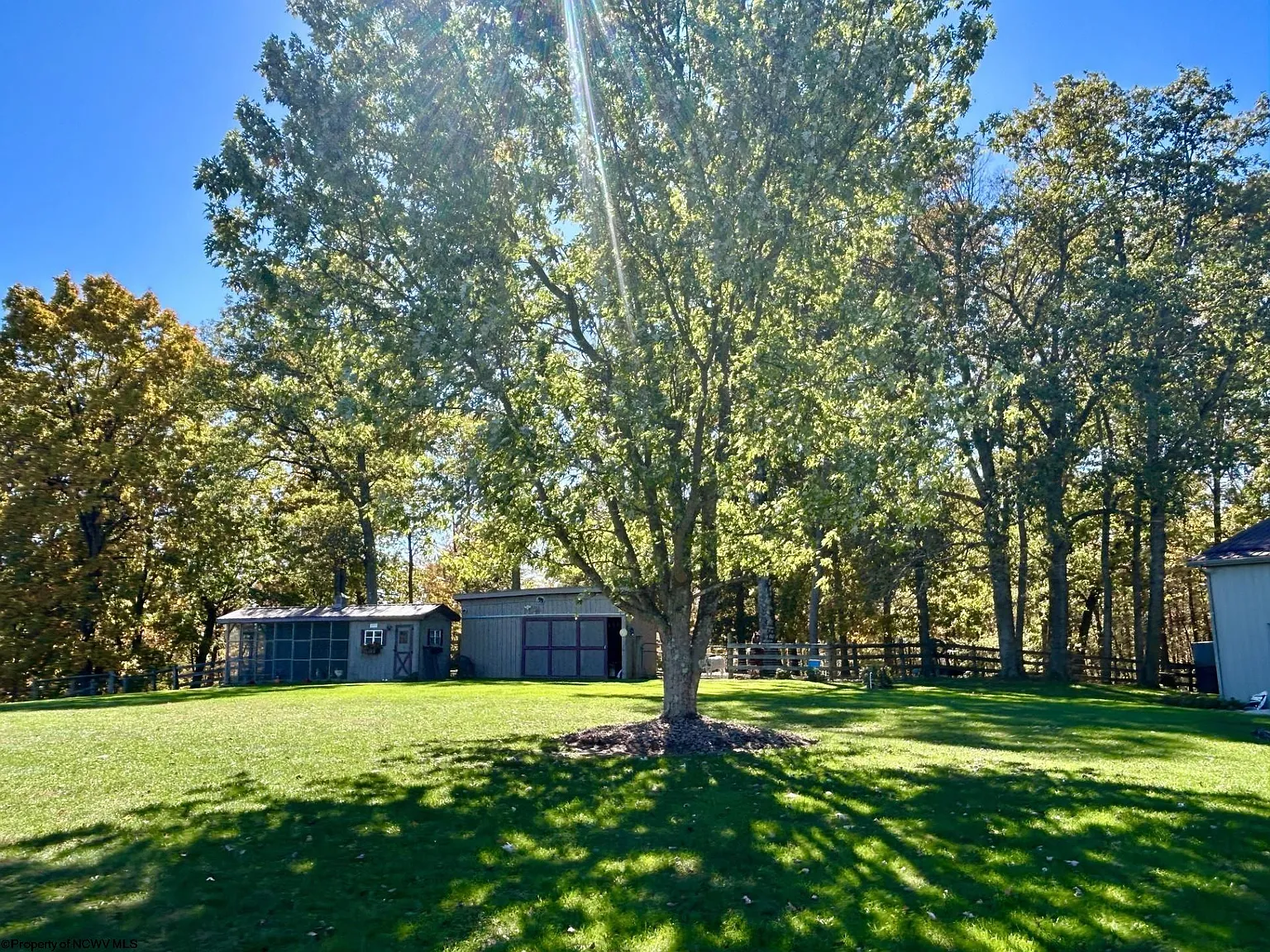 Several outbuildings are in place, including a horse barn, garage, and sheds. These structures provide storage and working space without needing immediate additions. There is enough land here for small-scale farming or recreational use.