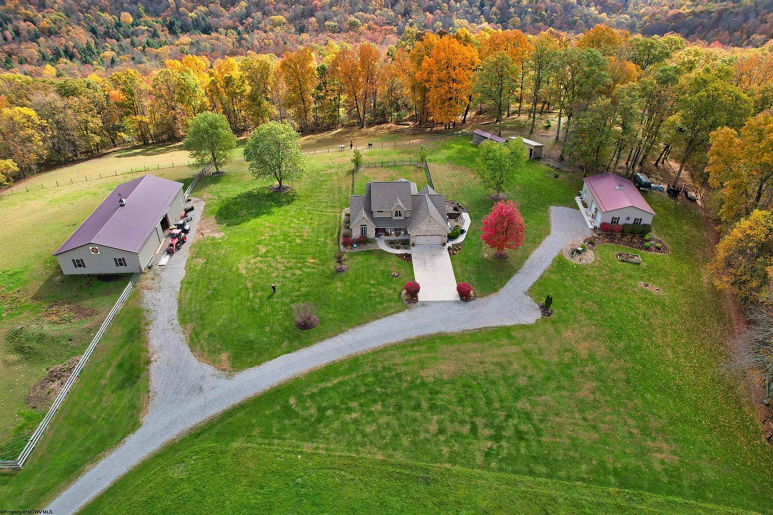 This 5-bedroom, 4-bath home sits on 27.2 acres in Bruceton Mill, West Virginia. The house offers about 4,100 square feet, along with a mix of open land and mountain views. The setup includes a pond, multiple outbuildings, and fenced areas for animals. This could work well for someone looking to combine country living with space for livestock or hobbies.