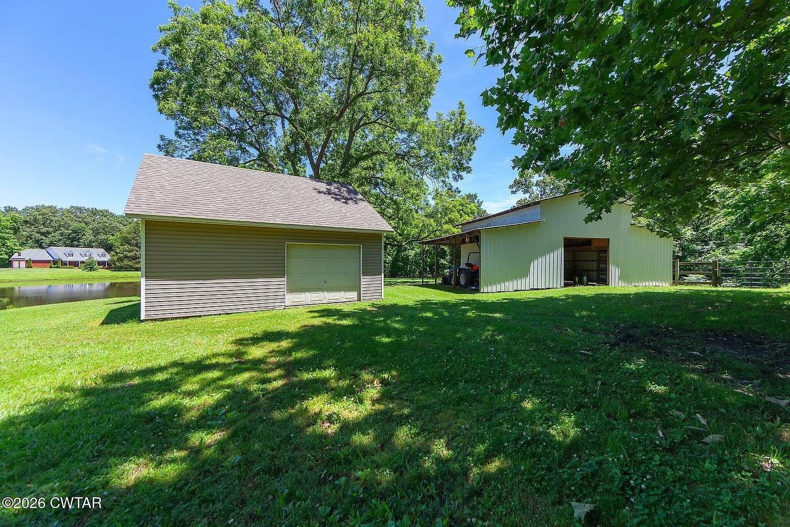 The 59.3 acres include a mix of pasture, wooded sections, and agricultural ground. A pond sits near the house and remains visible from the front porch. Fenced areas allow livestock or other small farm activity. The property also includes a barn and a wired workshop for storage or equipment. A private in-ground pool sits near the house for outdoor relaxation. The 16 by 20 deck offers a place for gatherings or quiet evenings.
