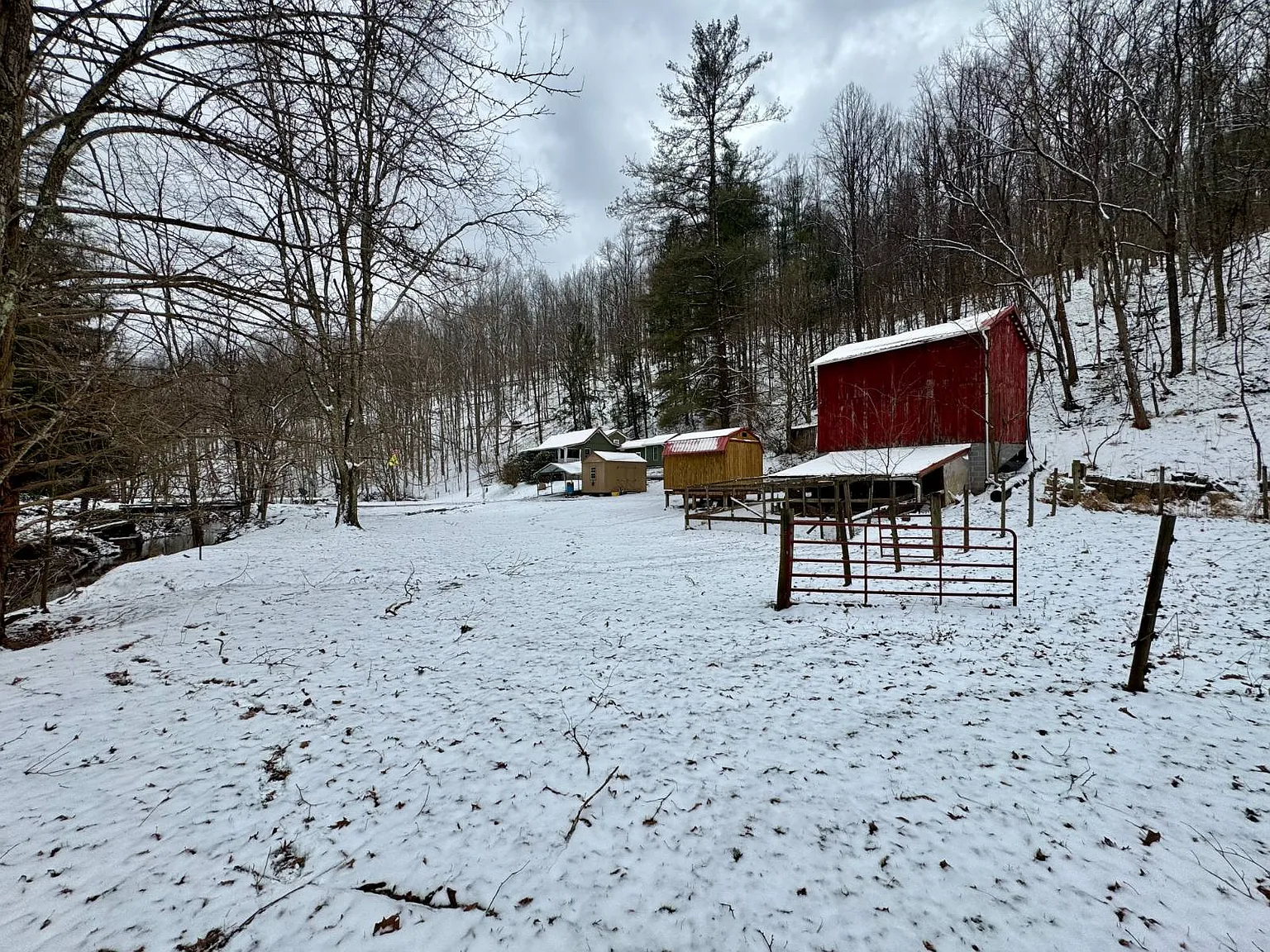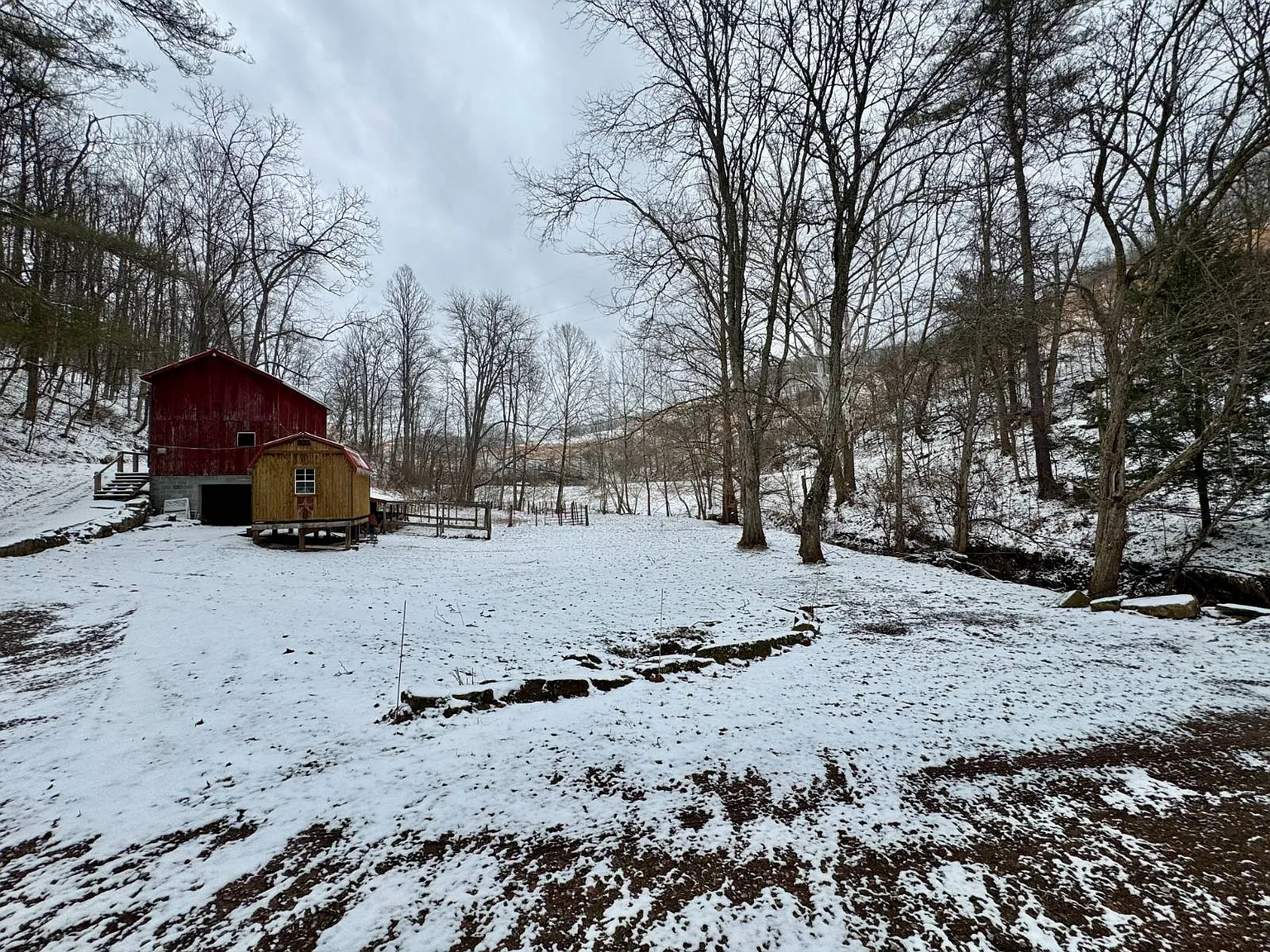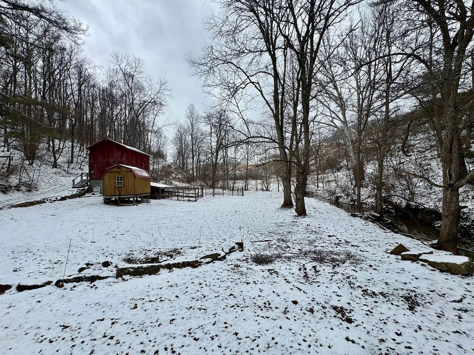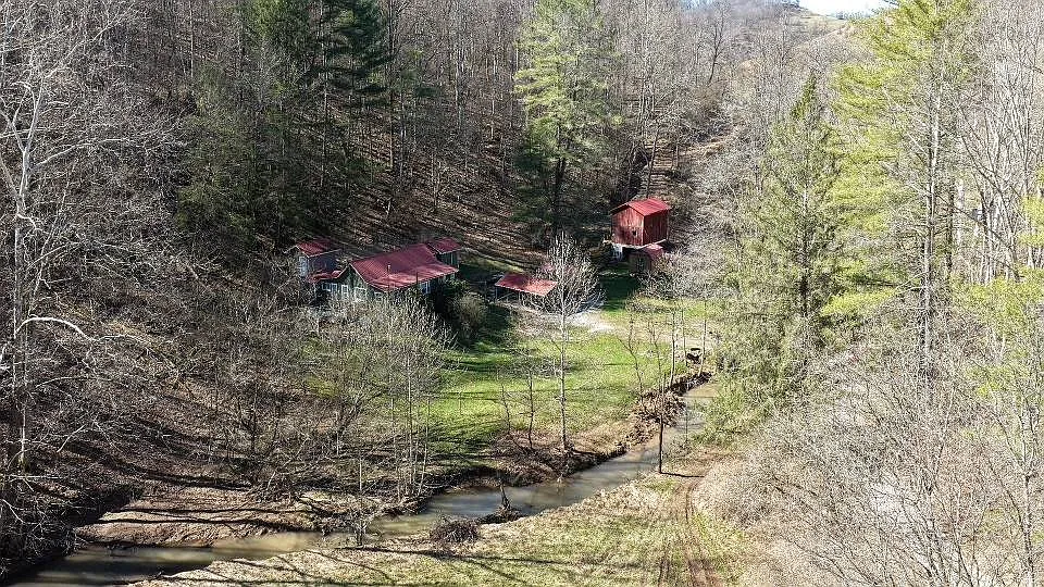 The creek running through the property adds a natural feature that may appeal to outdoor users. There are also trails and access points that make the land easier to navigate. The barn and additional buildings expand the usable space beyond the home itself.