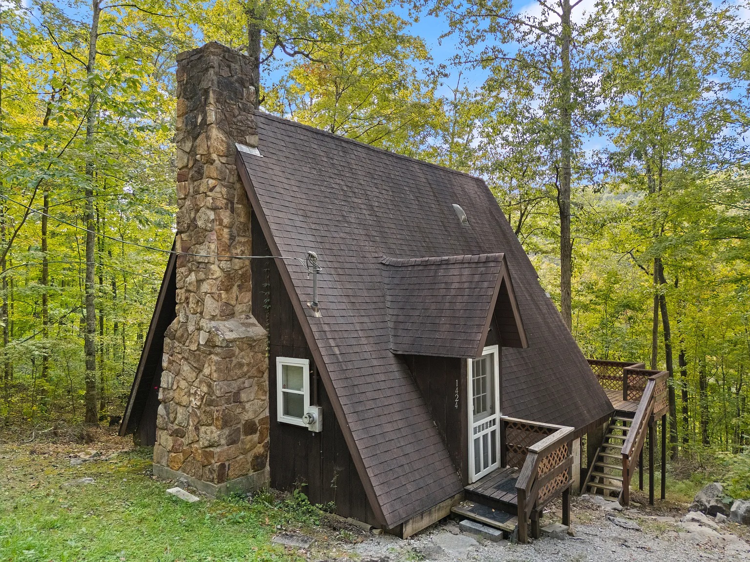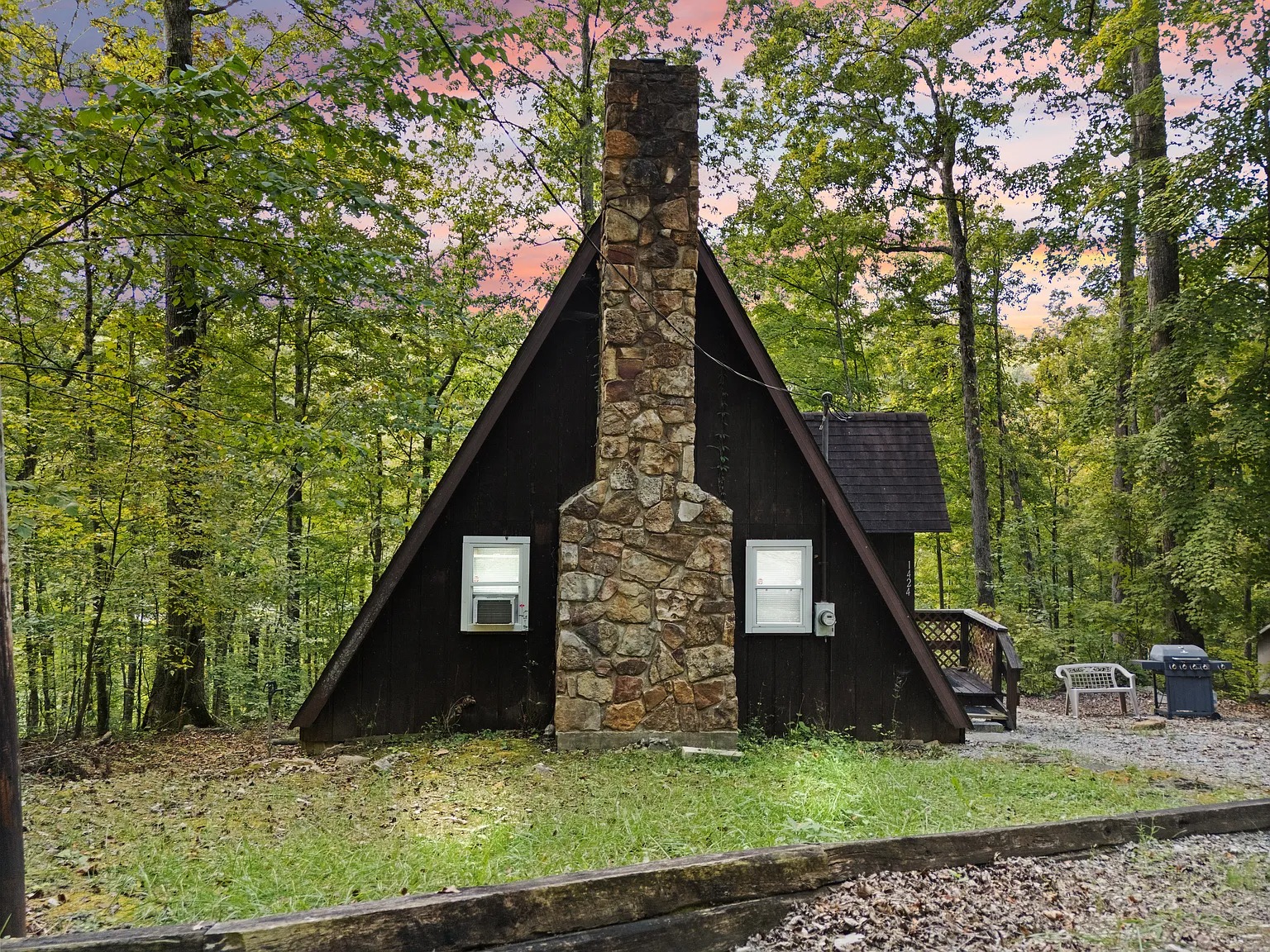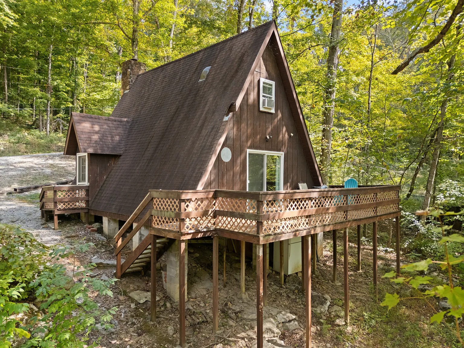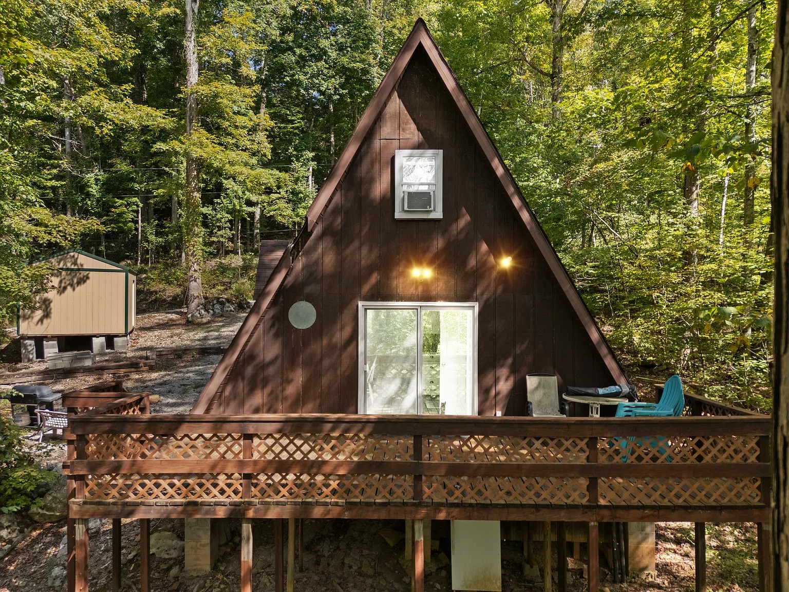 This A-frame cottage on Lake Cumberland offers a peaceful setting for relaxation and recreation. The 1,080-square-foot home features one bedroom and one bathroom on a 0.38-acre lot. The structure combines vintage style with modern updates, providing a comfortable space for full-time living or weekend stays.