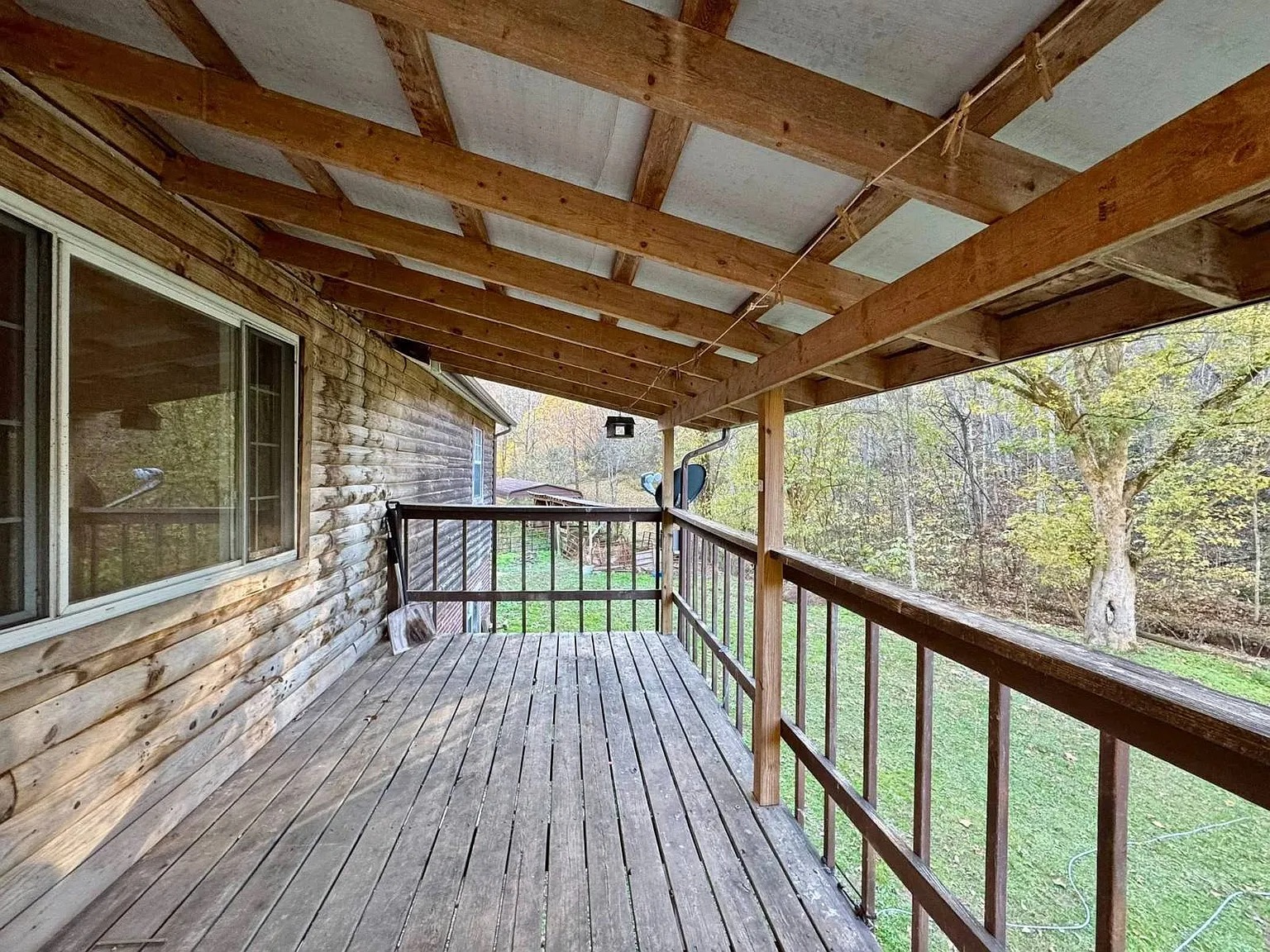 The raised-ranch log-sided home offers 896 square feet with two bedrooms and one bath. Moreover, tongue-and-groove wood interior walls create a warm cabin feel throughout the living area. Furthermore, the open floor plan connects the family room, kitchen, dining area, and laundry for convenient daily living. Plus, the home uses multiple heat sources including a mini-split, propane wall stove, and wood stove. Because of this setup, you enjoy efficient climate control in every season. Altogether, the home provides practical comfort with authentic country character.