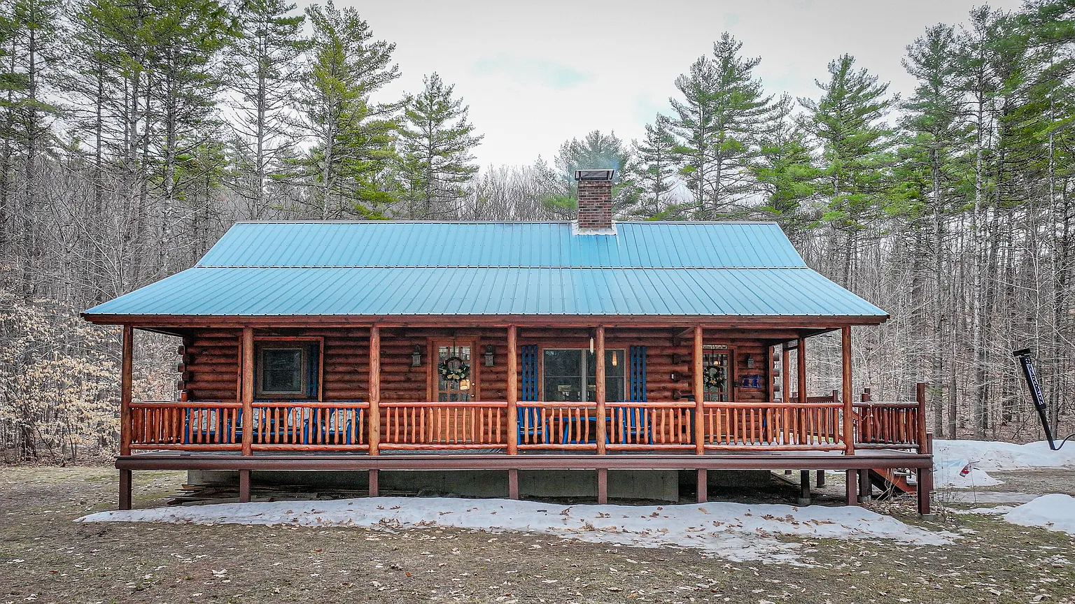 A 2002 log home sits on 6 acres in Denmark, Maine. The property includes three bedrooms and two bathrooms with 1,660 square feet of living space. A full-length covered front porch runs across the front. This setup could suit someone who wants year-round country living or a seasonal retreat in a private setting.