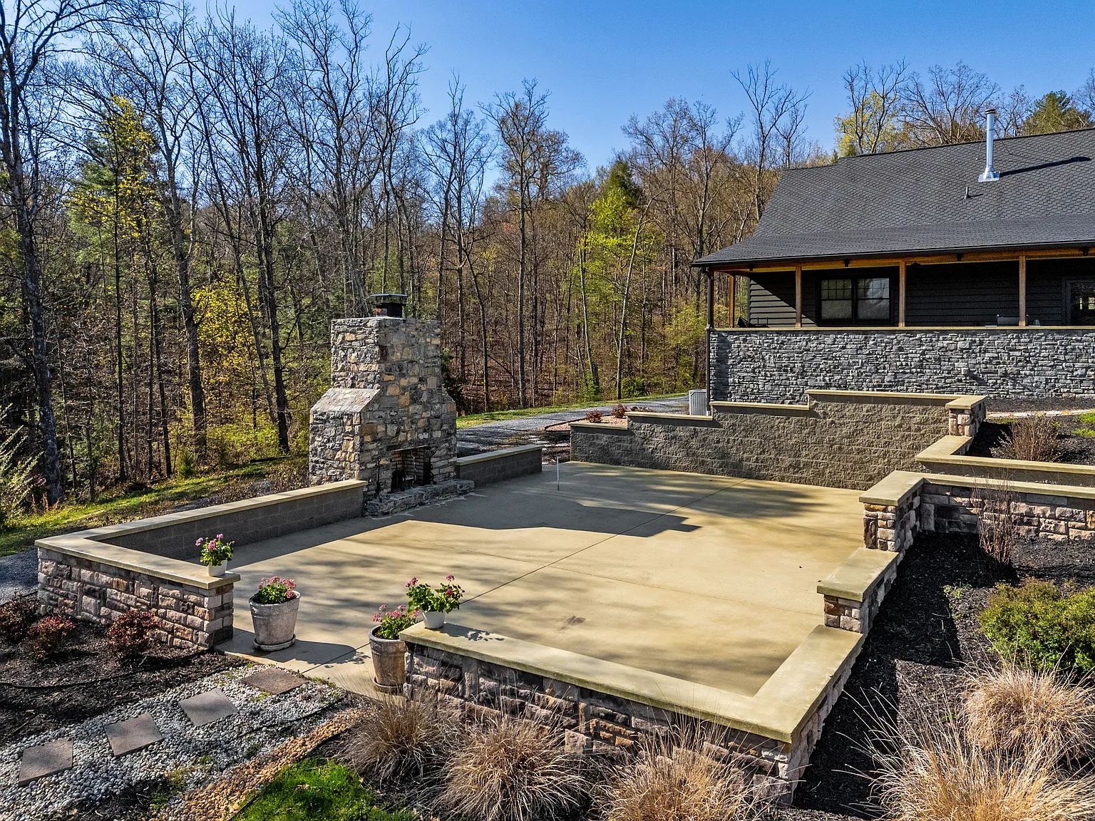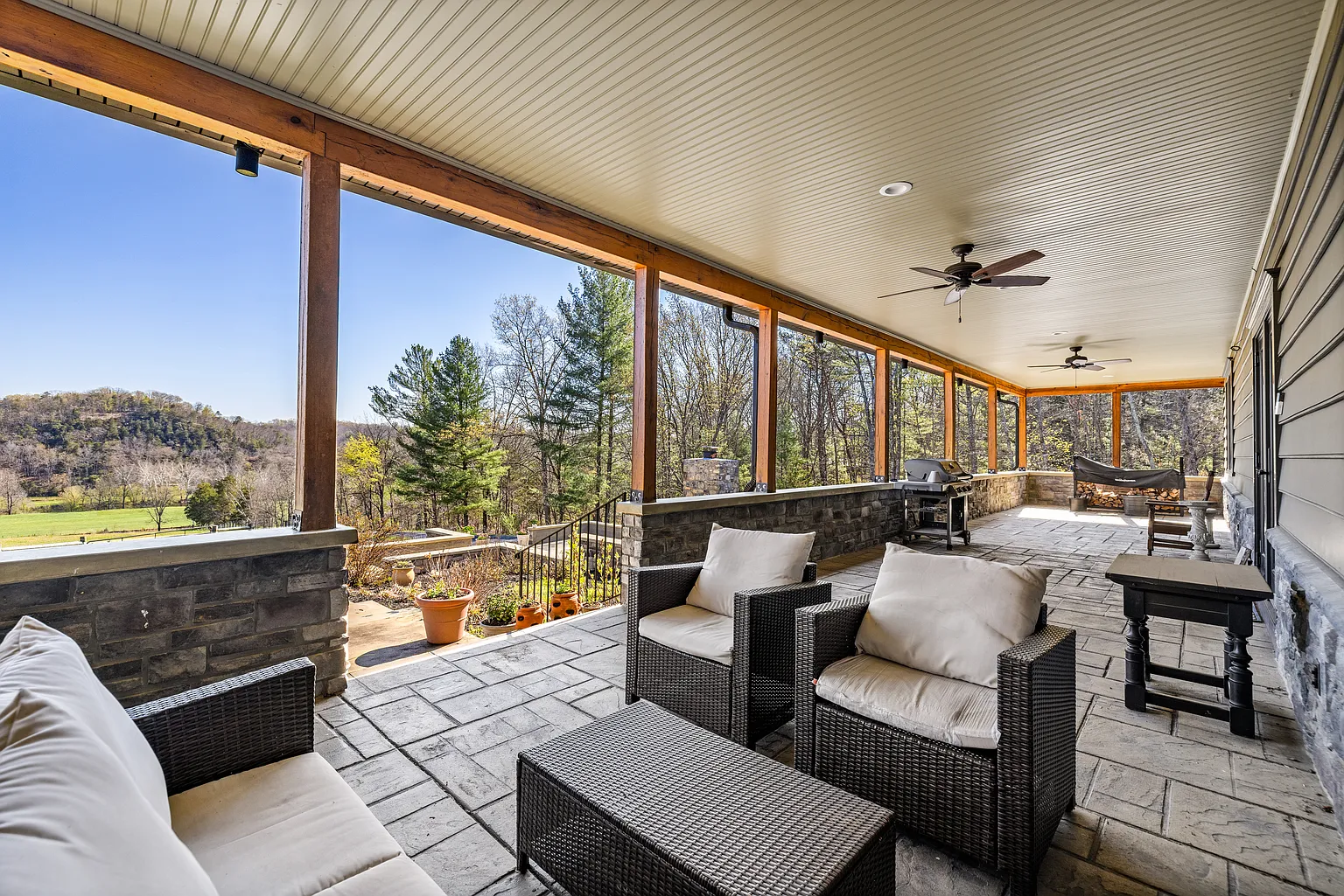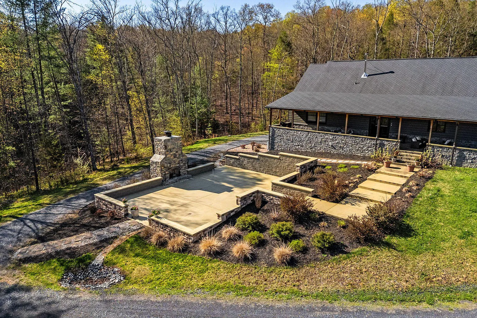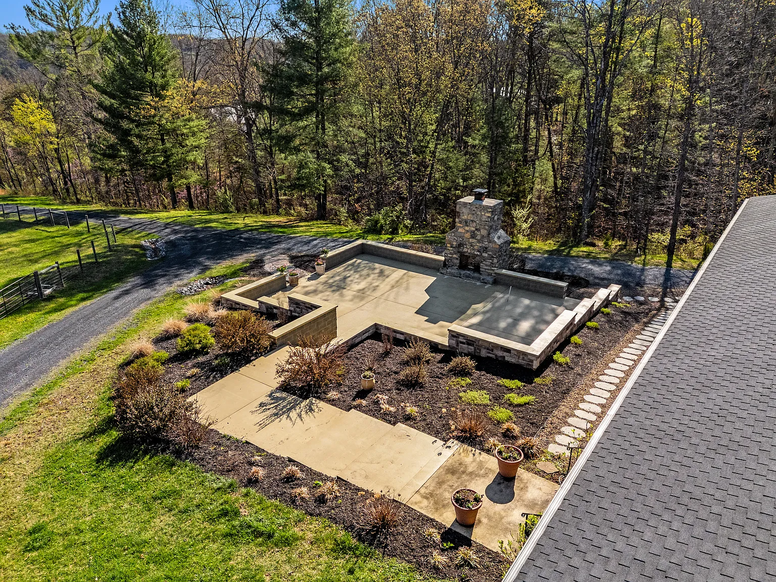 The 55.88 acres mix open pasture and mature woodland. Over 1,000 feet of river frontage gives direct access to the North Fork Shenandoah River. A tiered terrace below the porch holds a large concrete patio, stone seating, landscaped beds, and a wood-burning masonry fireplace.