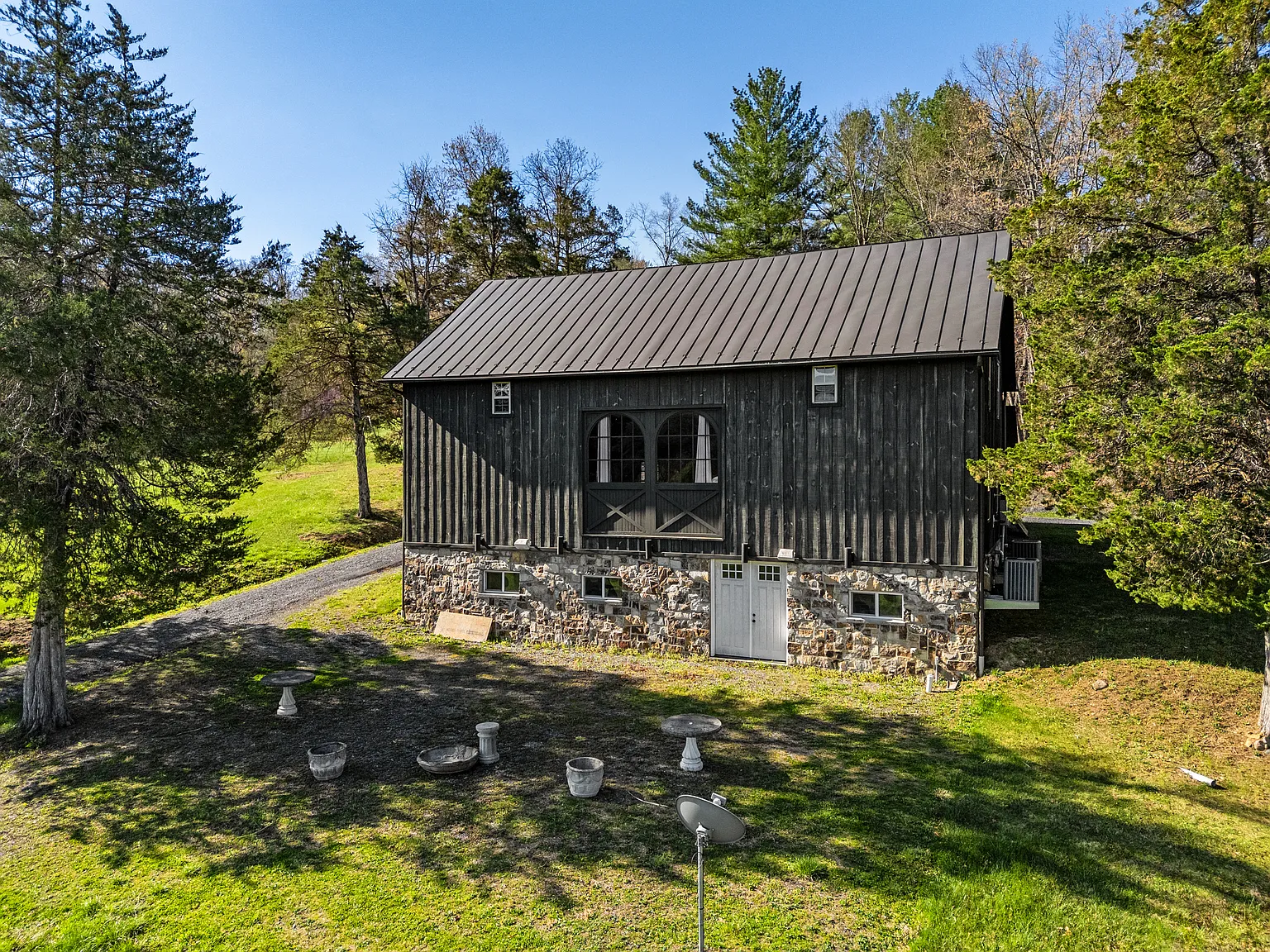 The home uses 2×6 framing, stone and HardiePlank siding, and locally milled hardwood flooring from trees on the property. Owners added antique doors from around the world and quality fixtures throughout. A renovated bank barn now serves as guest accommodations with its own well and septic.