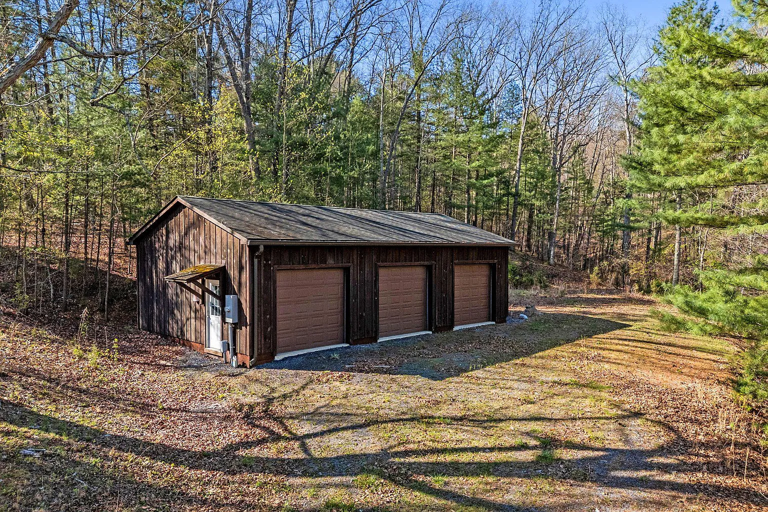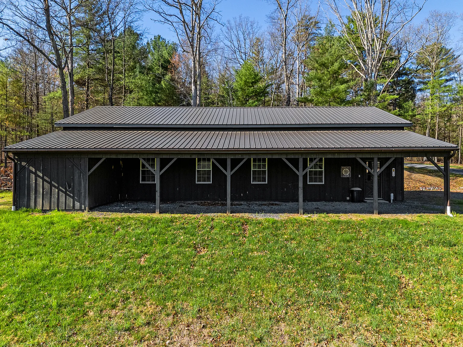 Outbuildings include a three-bay garage and a 60 by 30 foot tractor barn with a mechanicals room. The bank barn guest house features a kitchen, raised stage, two bedrooms, and cathedral ceilings. You could use the extra structures for equipment, hobbies, or visitors.