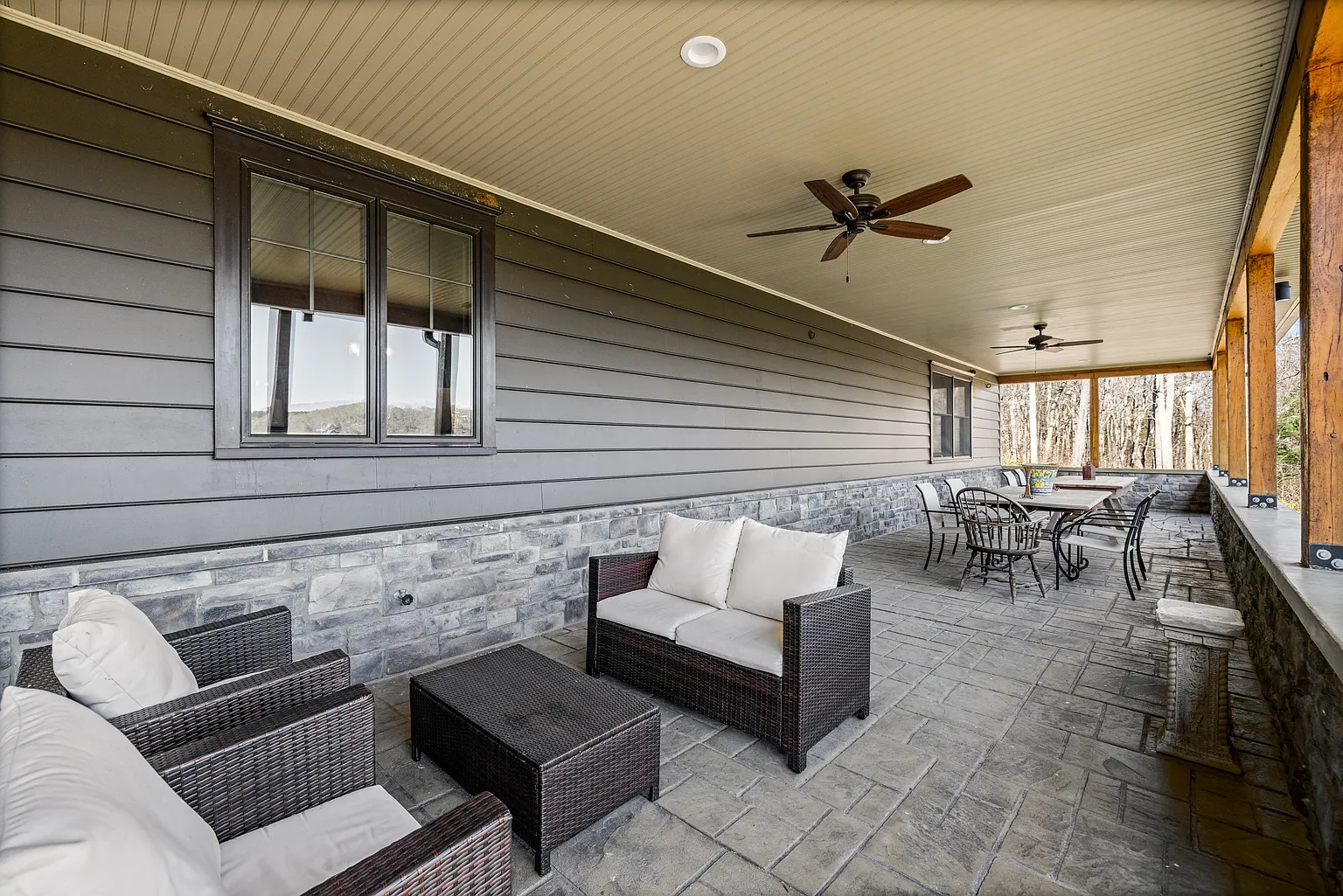 The covered porch runs full width and faces northeast. It opens right from the kitchen and sitting area. Many people use this kind of layout when they want indoor and outdoor space to blend without extra effort.