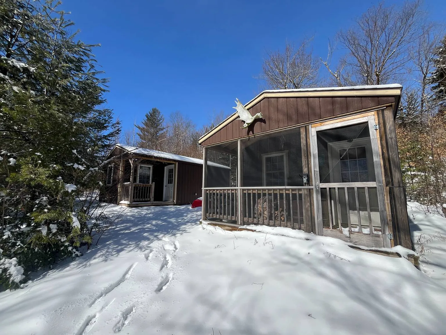 This 61.5-acre wooded property lies in the Town of Parishville near Potsdam, New York. It functions as recreational land rather than a finished home. Two turnkey cabins and a storage container sit on the lot. One cabin serves as a living area while the other acts as a bunkhouse with four beds. The setup suits hunting, camping, or seasonal outdoor use in a secluded spot.