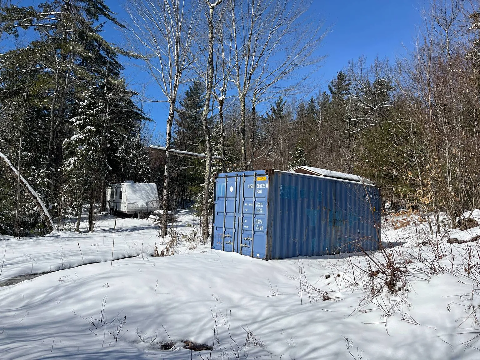 The property offers strong potential for hunting and recreation. It borders state land, which expands access to thousands of acres for outdoor activities. The cabins come fully furnished and ready for use. Both structures include wood stoves and wiring for a generator. A storage container keeps equipment secure and dry. These features make the land practical for seasonal stays or weekend trips without major setup work.